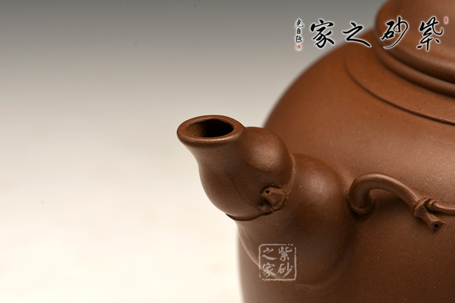 以竹入壺,以竹飾壺,以竹名壺。作品可以用形、神、態(tài)、韻四個字來概括,以佛肚竹為造型靈感,造型獨特,手執(zhí)舒適。壺身為竹節(jié)狀,圓潤飽滿,線條流暢。壺嘴、壺把與壺鈕皆取竹節(jié)之形,彎曲遒勁。嫩竹附于壺身,竹節(jié)自然之態(tài),形象逼真,竹葉無風(fēng)自動,惟妙惟肖。