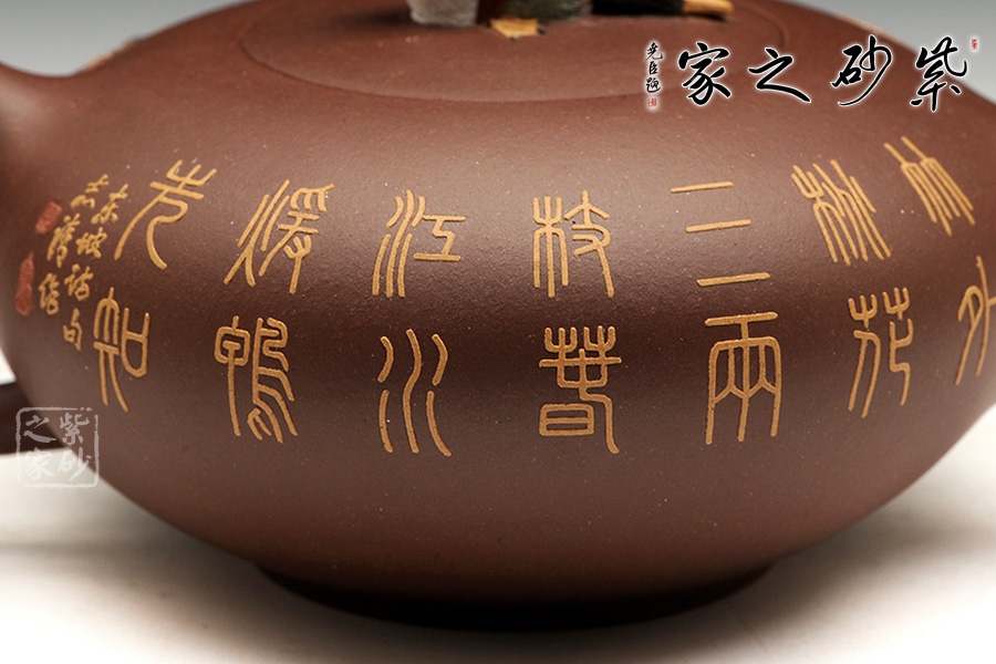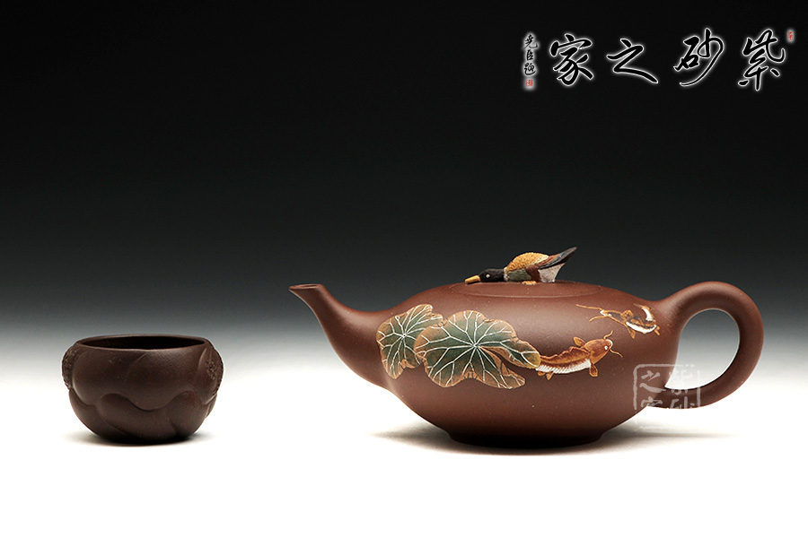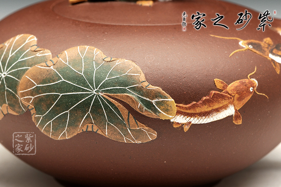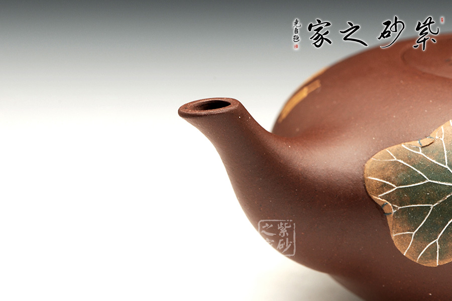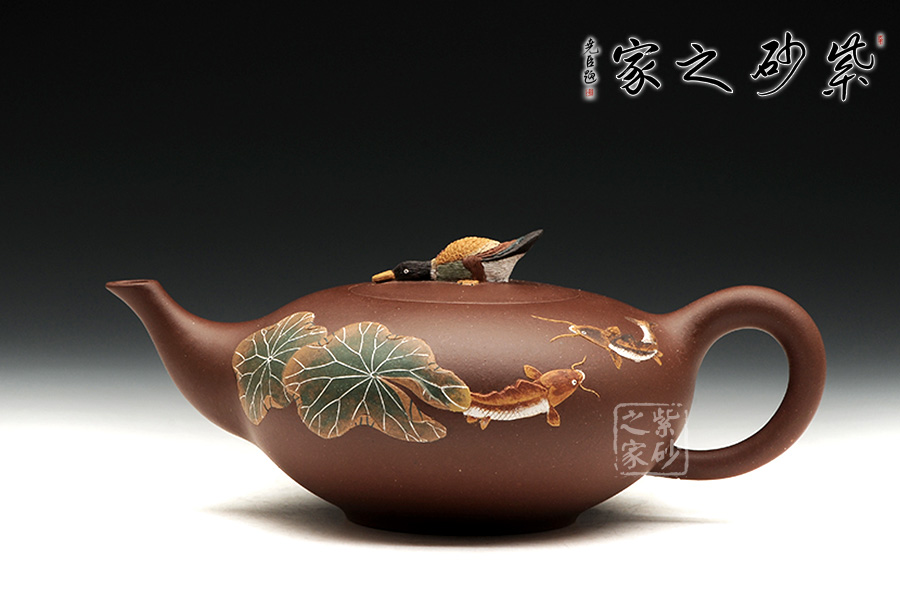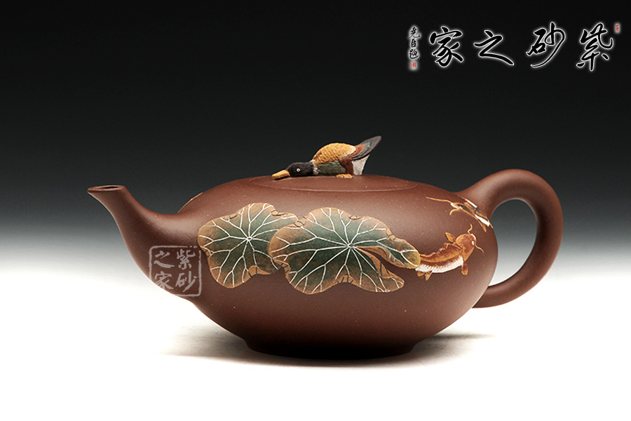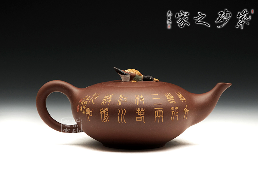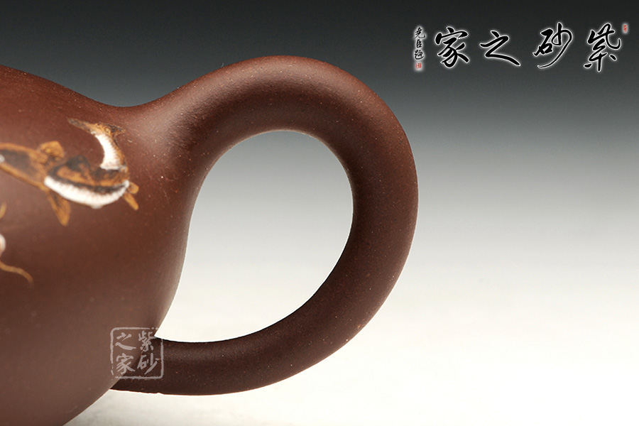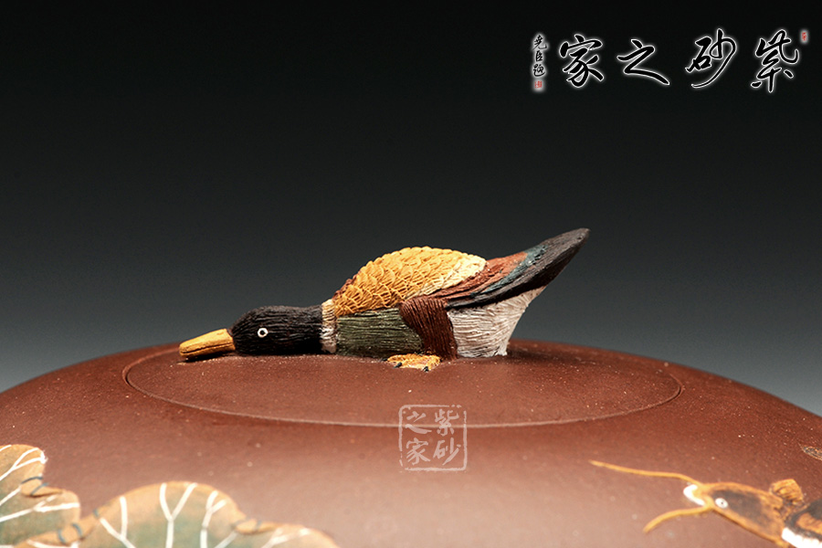 整款器型秀美端莊,造型雅致,壺嘴修長上延,耳型把挺括,像一盞神燈,氣韻神秘悠揚(yáng)。壺身正面有泥繪鴨趣圖,與壺渾然一體,大氣之作。壺鈕是一只野鴨,趴伏在神燈上,生動、細(xì)致地描繪了大智然趣味盎然的景象,堪稱是取材自然、提煉自然的佳作。雙面泥繪,色彩豐富,值得收藏。