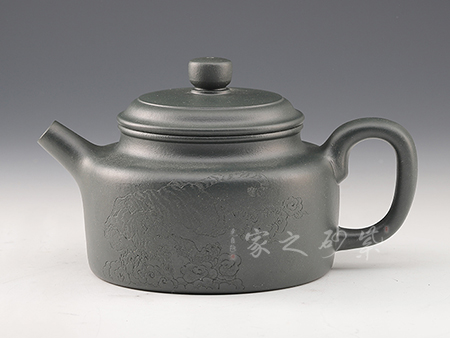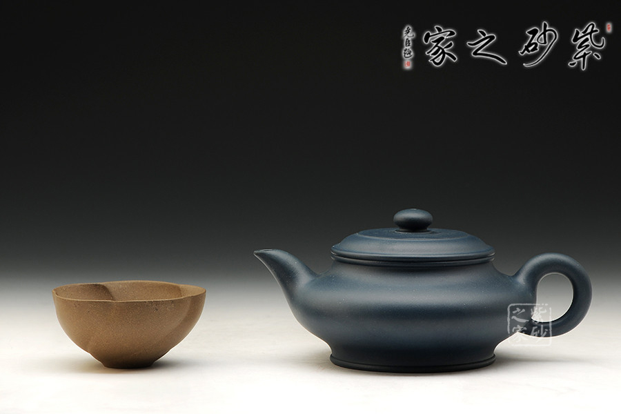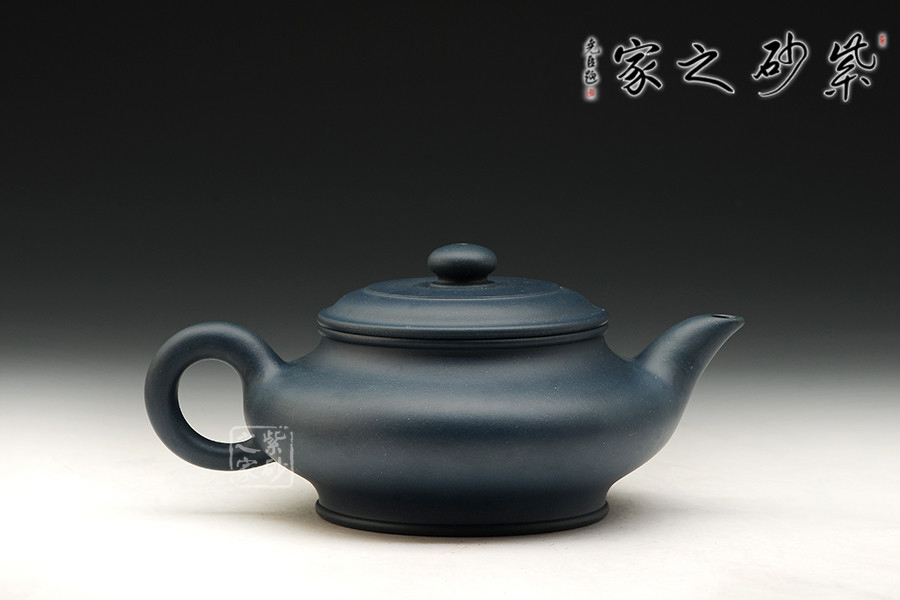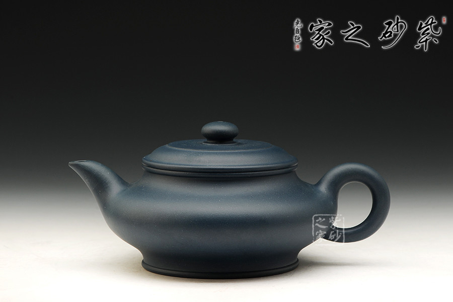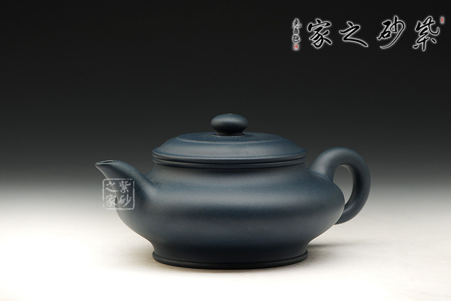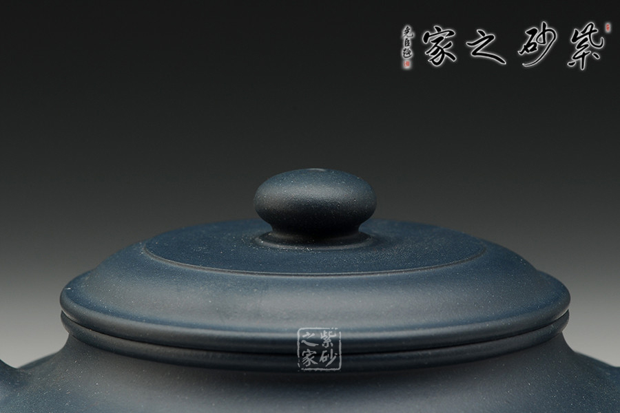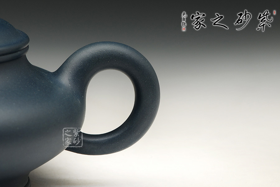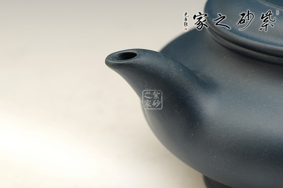 一廠60年代原礦綠泥為料,泥料細膩,顏色純正,散發(fā)出藍寶石一樣美麗誘人的色澤。此壺古樸大氣,線條優(yōu)美,簡潔穩(wěn)重。壺底、壺腹、壺口、壺蓋、壺鈕形成了五重圓圈疊加的線條,配以壺把的環(huán)形曲線與壺流微翹的曲線,整個壺由環(huán)環(huán)相扣的優(yōu)美流暢的線條組成,給人以強烈的視覺沖擊。其做工精細,壺蓋與壺口嚴絲合縫,壺蓋絲紋不動,壺的每一個平面均光滑平整,整個壺泛著幽藍的光澤,散發(fā)著高貴典雅的氣質(zhì)。