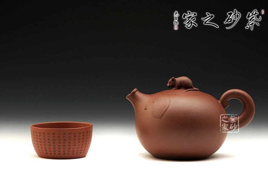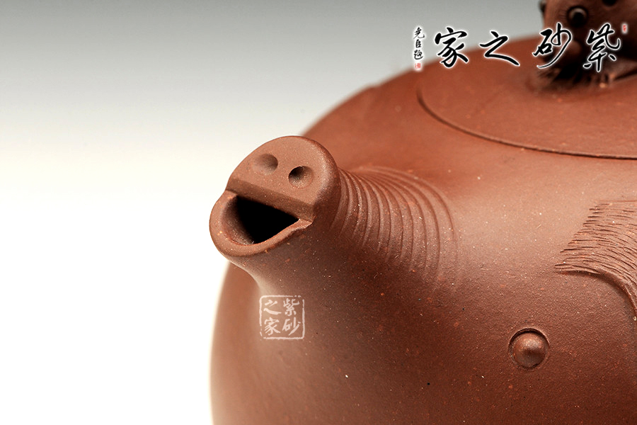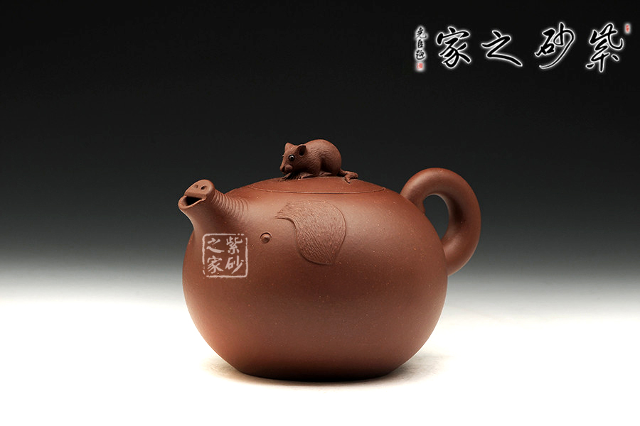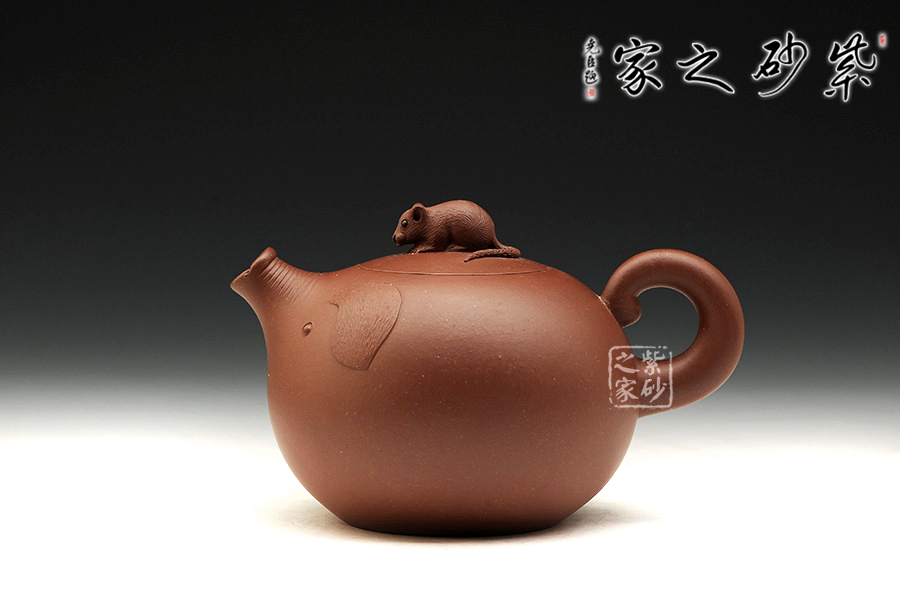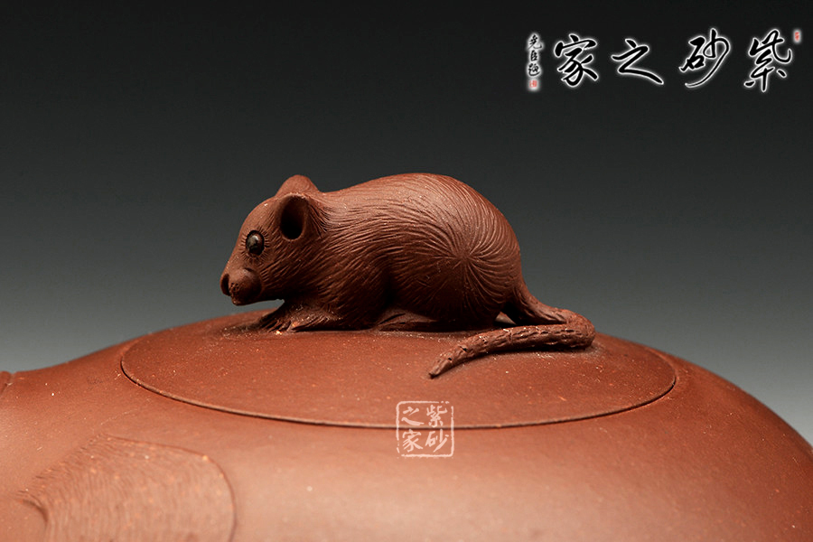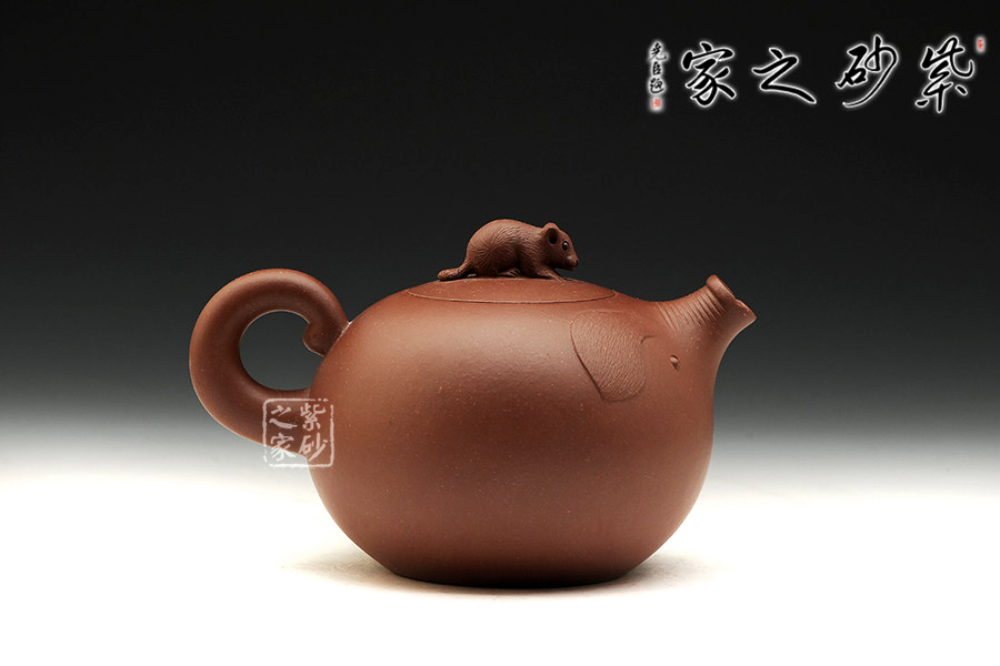 作品選用紫砂一廠60年代的老紫泥制作,泥質(zhì)細(xì)膩,異常珍貴,做一少一。整器以一只可愛的小豬為型,非常靈動(dòng)敏銳,胖乎乎的身體為壺身,飽滿而有動(dòng)感;鼻子為嘴、尾巴為把,做工十分細(xì)致,一只精致的老鼠為鈕,將整器的靈動(dòng)感提升。豬象征著福,故有托著福氣之意,寓意佳。