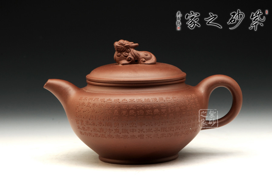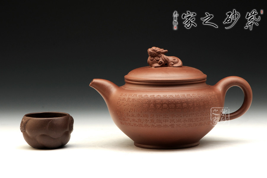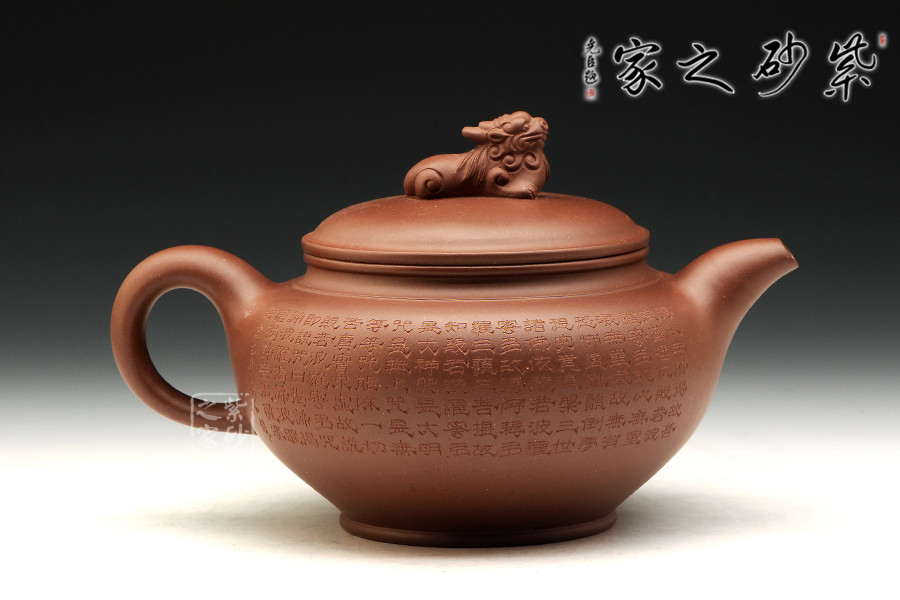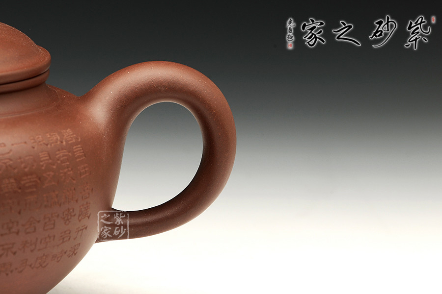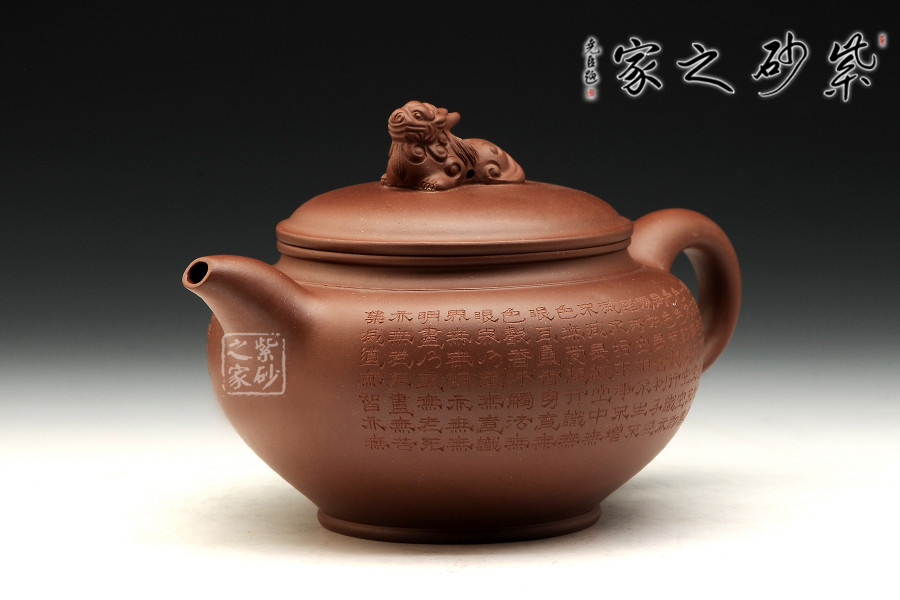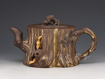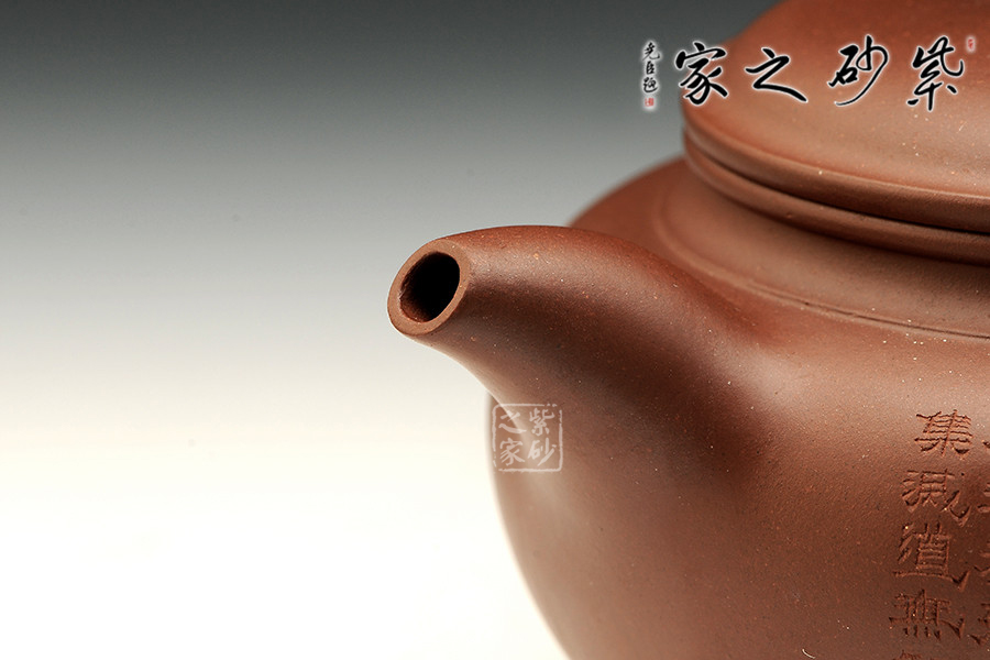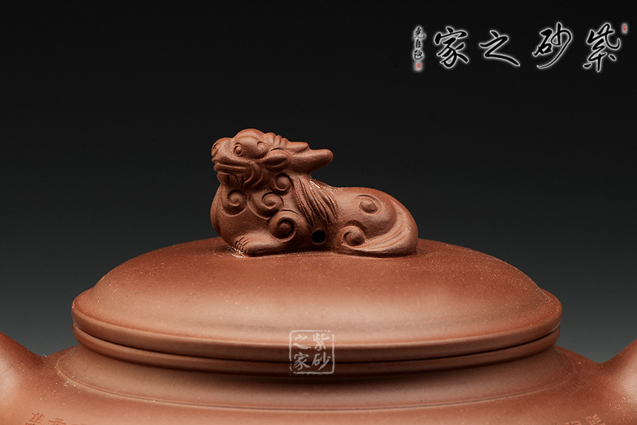 一廠60年代底槽青泥制作,泥料絕對的純正,適宜泡養(yǎng)。作品以掇只為型,紫氣瑩潤可愛。造型簡練,大方,球腹,矮頸,短流,把如肥耳,流把勻稱自然,口蓋直而緊縫,蓋上以瑞獸為鈕,福滿乾坤。壺形樸拙渾厚,造工精細(xì),美妙絕倫。