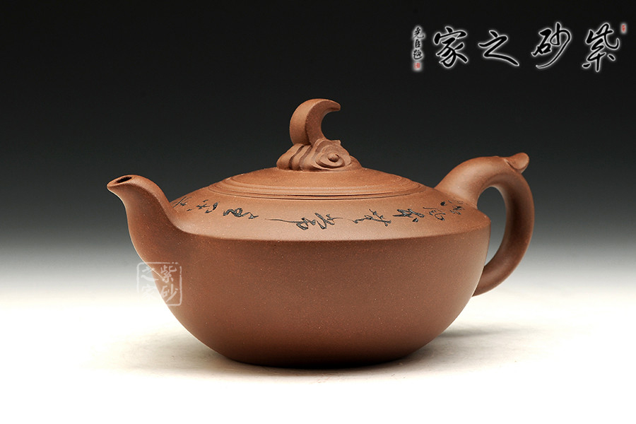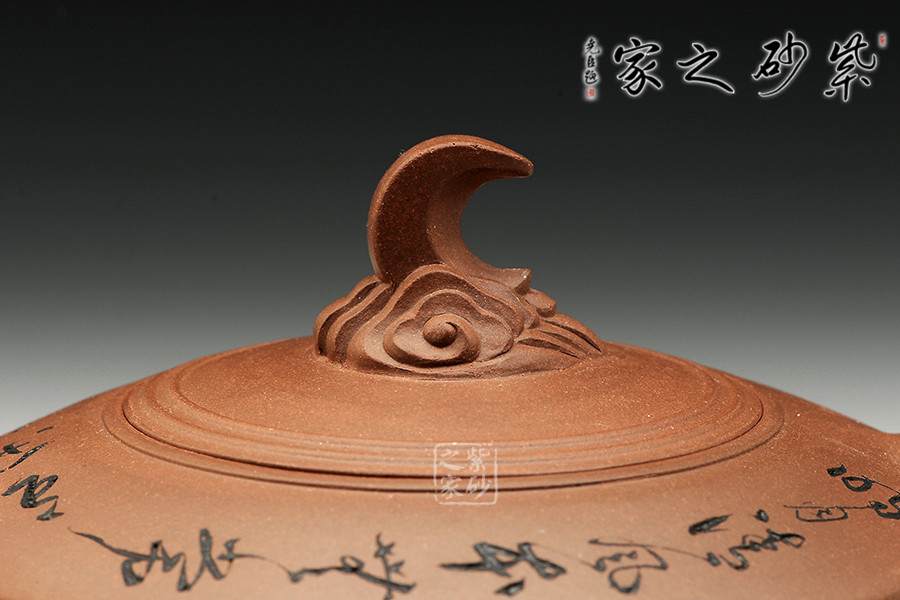 此壺創(chuàng)意十足,雖無(wú)風(fēng)但從壺身裝飾卻能感受到風(fēng)的存在,云端上的月,彎彎掛起,一幅明月清風(fēng)的畫面便浮現(xiàn)在腦海里。壺身呈碗狀,上豐下儉,收納之姿。壺肩寬厚,肩線延伸至壺嘴與壺把。彎流胥出有力,耳把帶飛,隨行自如。嵌蓋深入壺體,不僅密封好,而且恰好與平肩處于同一平面上,毫無(wú)突兀之感。壺鈕雕塑彩云,壺蓋之上圈線似為清風(fēng)之下,泛起的圈圈波紋,明月空照,別具特色,云彩甚至蕩起圈圈漣漪在蓋沿。整壺氣質(zhì)高雅淡泊,別有雅致。