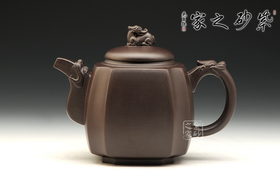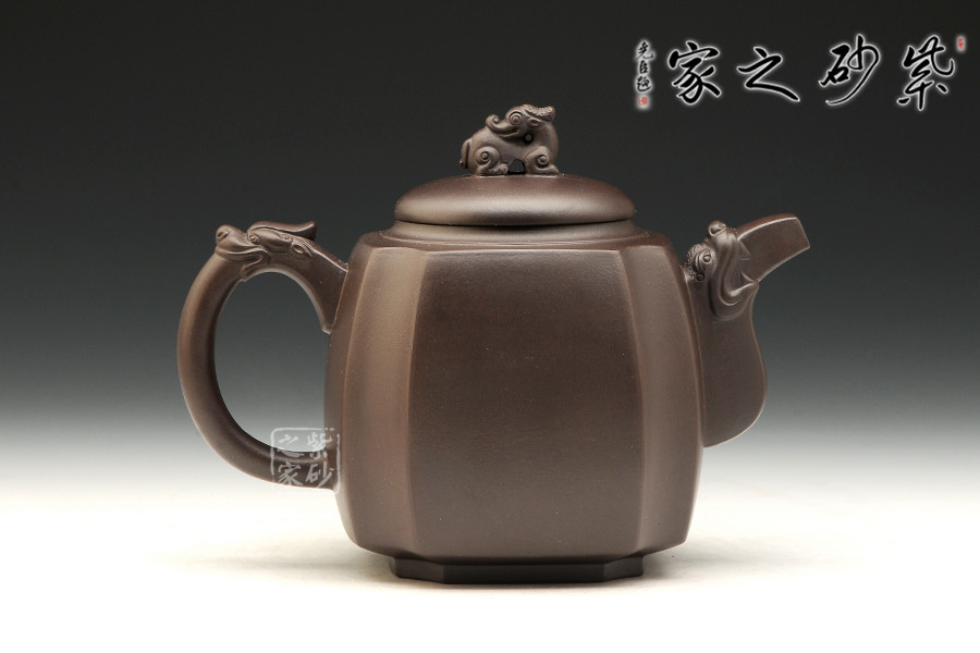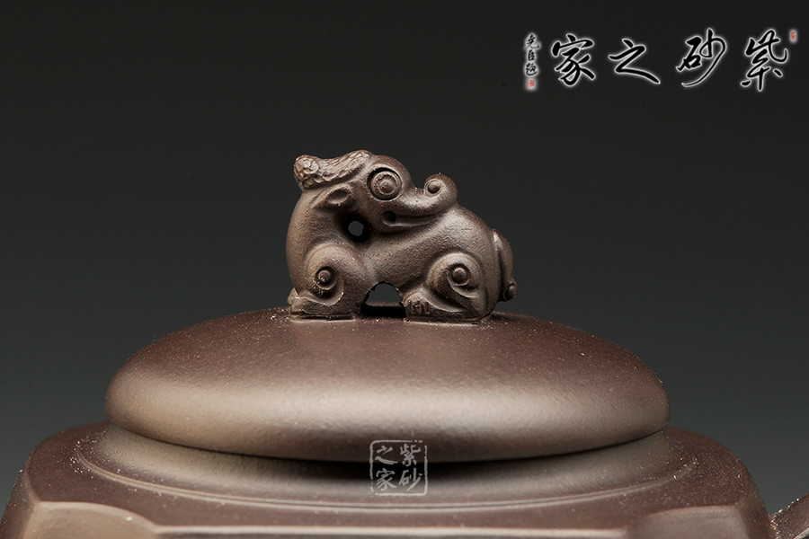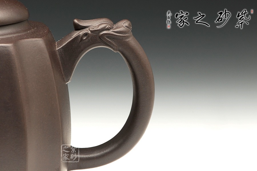 此壺非常考驗(yàn)老師功力,方中有圓,圓中帶方,西方壺體,但圓潤飽滿,四抽角,線條分明,凹凸有致。壺肩平整,半圓形壓蓋,壺鈕是一條龍形,回首展望,威武霸氣。壺嘴、壺把形成雙龍頭,一吐一納間,翻江倒海,潺潺流水聲而至,奠定其尊位。
