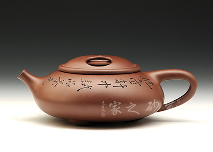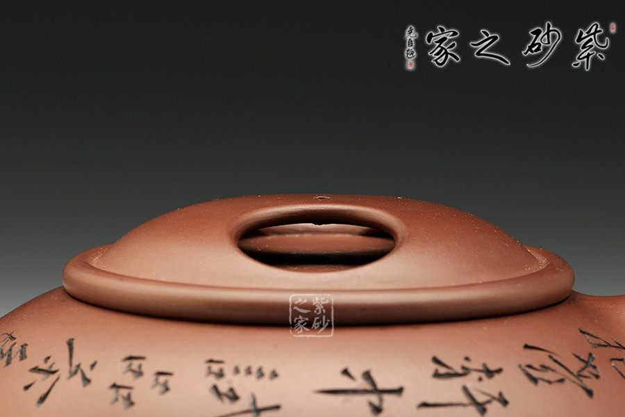 此壺源于石瓢壺式,壺蓋為牛蓋式,壺身較為豐扁,圍棋子三足,托起穩(wěn)重的壺身,增添輕盈之趣。三角形壺鋬,直流,提拿方便,出水流暢。牛蓋壺蓋揭蓋合手,沏茶品茗十分便利。著名陶刻家譚泉海雙面刻繪,雙面刻繪刀法利落,情趣韻味高雅,收藏價(jià)值倍增。