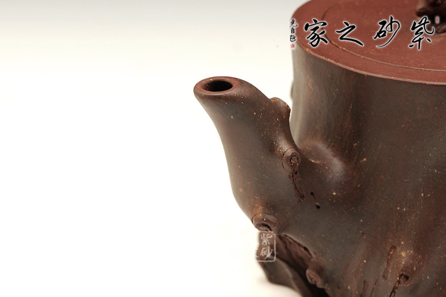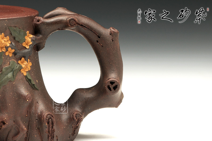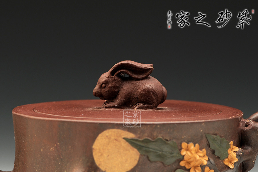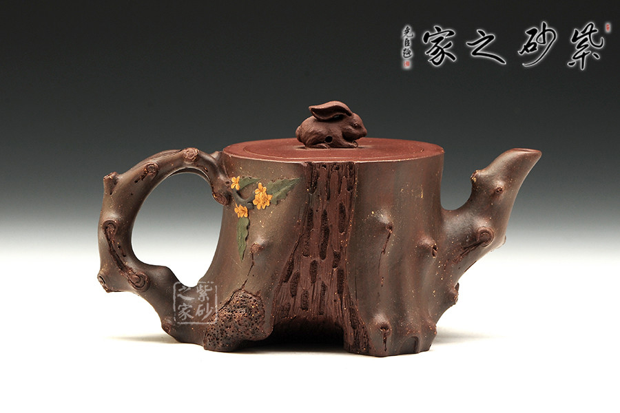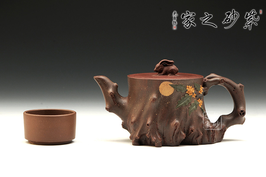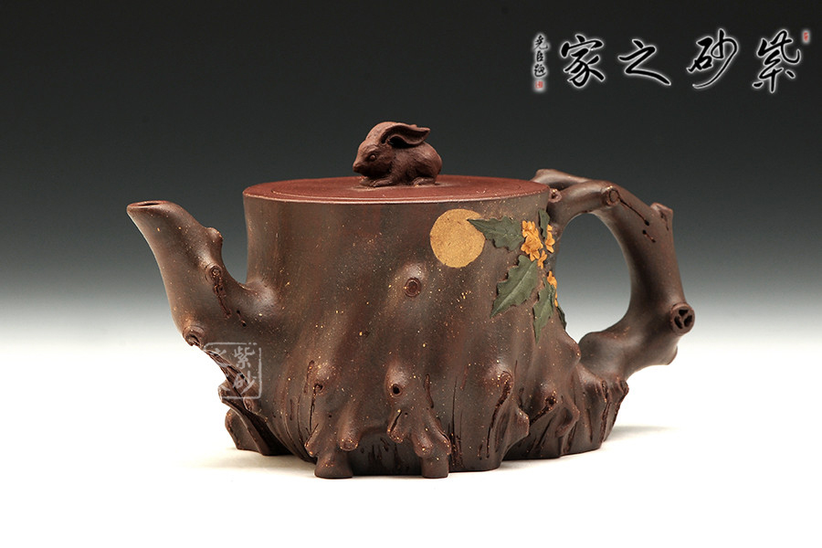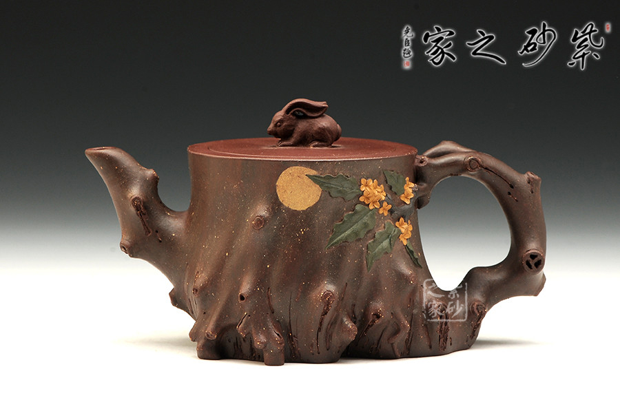 壺身用了樹樁的形象,一輪圓月明澈穹宇,桂花樹樁上,一只月兔靜靜守月,桂花樹、玉兔、明月構(gòu)成了一幅中秋團(tuán)圓圖。作品絕妙之處,莫過于壺底巧妙的表現(xiàn)了一幅中國地圖。樹樁穩(wěn)妥古拙,枝干蒼勁,是堅(jiān)強(qiáng)與不屈的象征,它象征著自強(qiáng)不息的中華民族。此款《中華根》是一件工藝近乎完美,內(nèi)涵極高的紫砂作品,寓意深遠(yuǎn),情真意切。