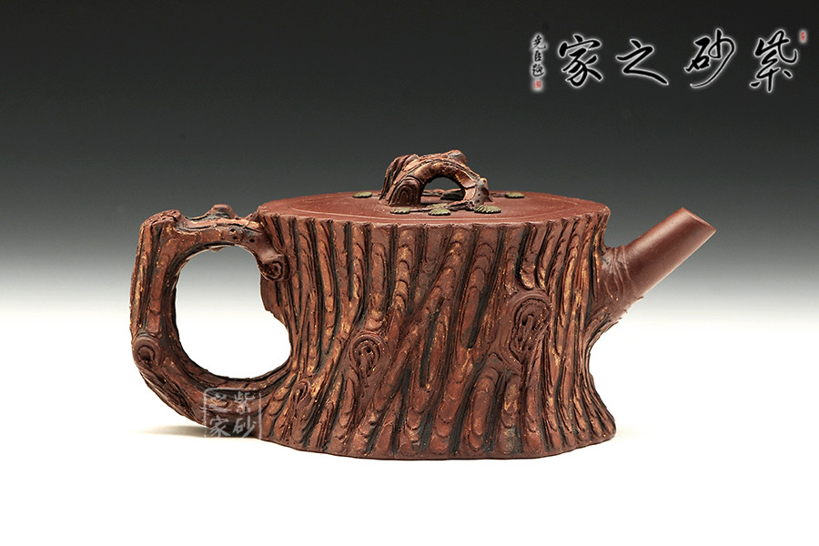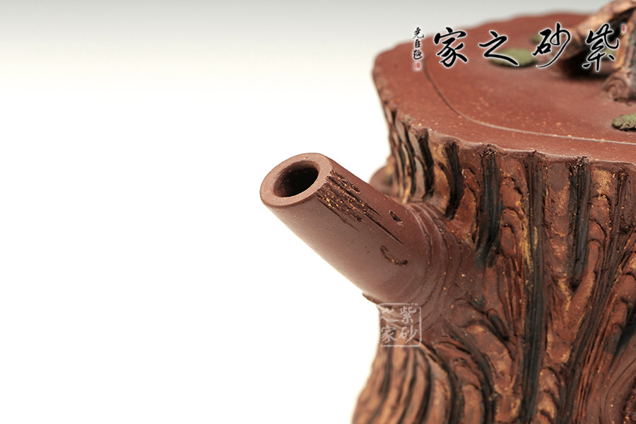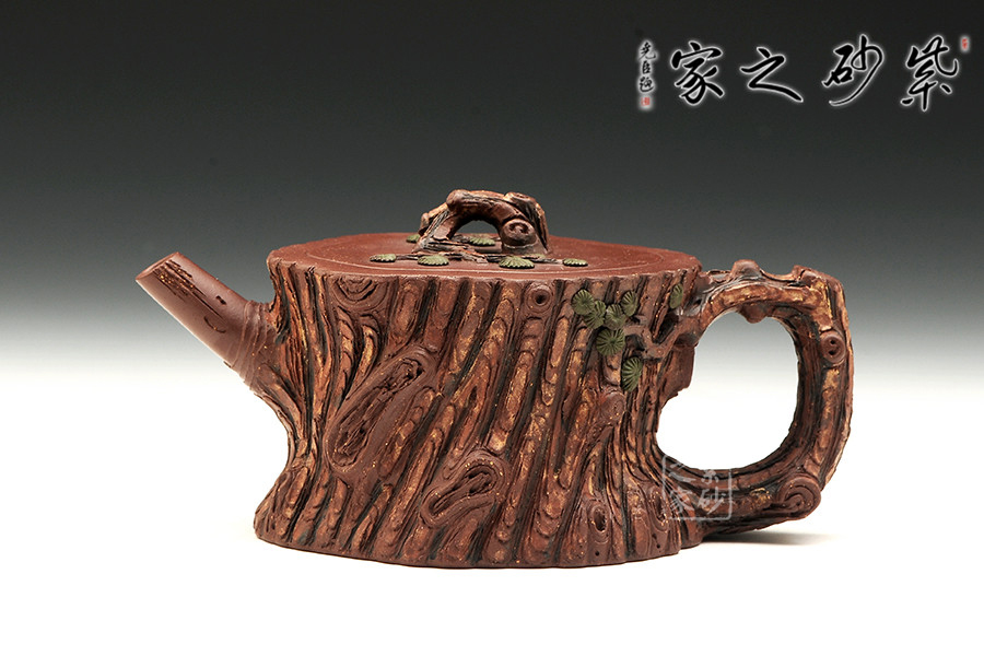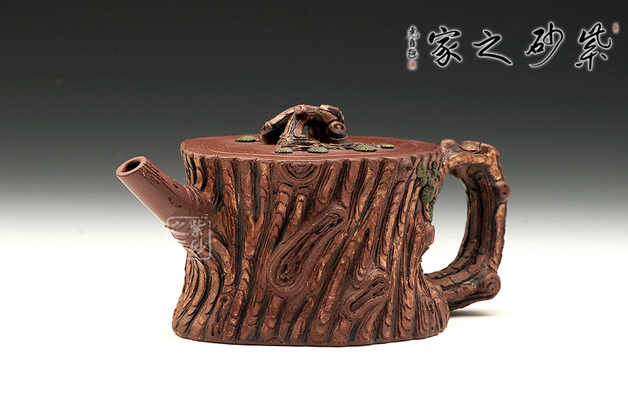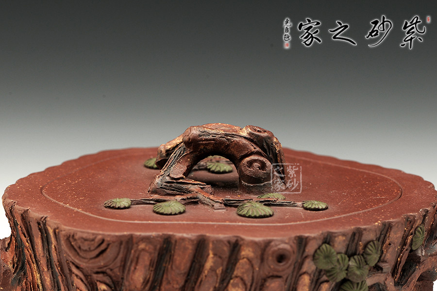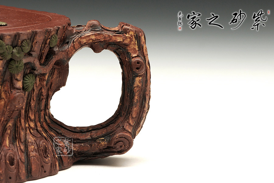 該作取松樁為形,壺面仿古松外皮,層層迭迭,頗具老味。壺身流把蓋各部皆做松樹枝節(jié),壺鈕巧取松枝一段,匍匐貼合于蓋上,其上松針青綠,極其逼真。嵌蓋一圈,吻合嚴(yán)密,仿若樹木年輪,以松者喻壽也。作者潛心工藝,不但將松樹的形態(tài)展現(xiàn)無疑,更將其滄桑的意盡表現(xiàn)得恰如其分,于此作中注入益壽延年的美好期許,古樸生動,優(yōu)雅動人。