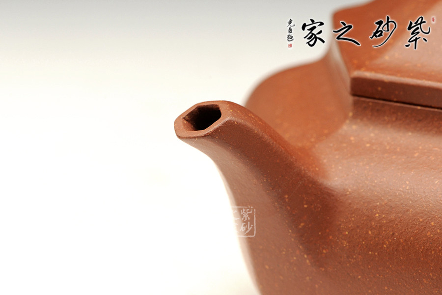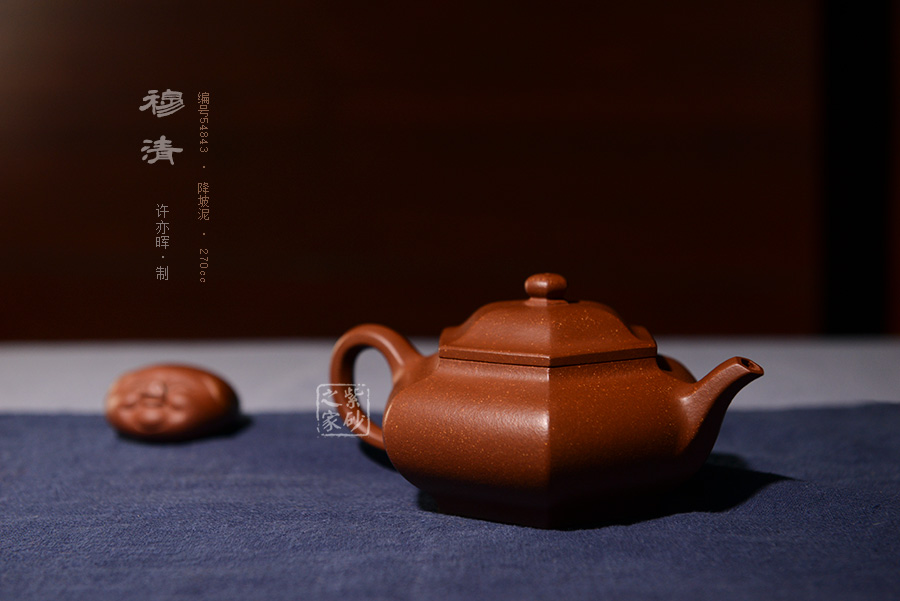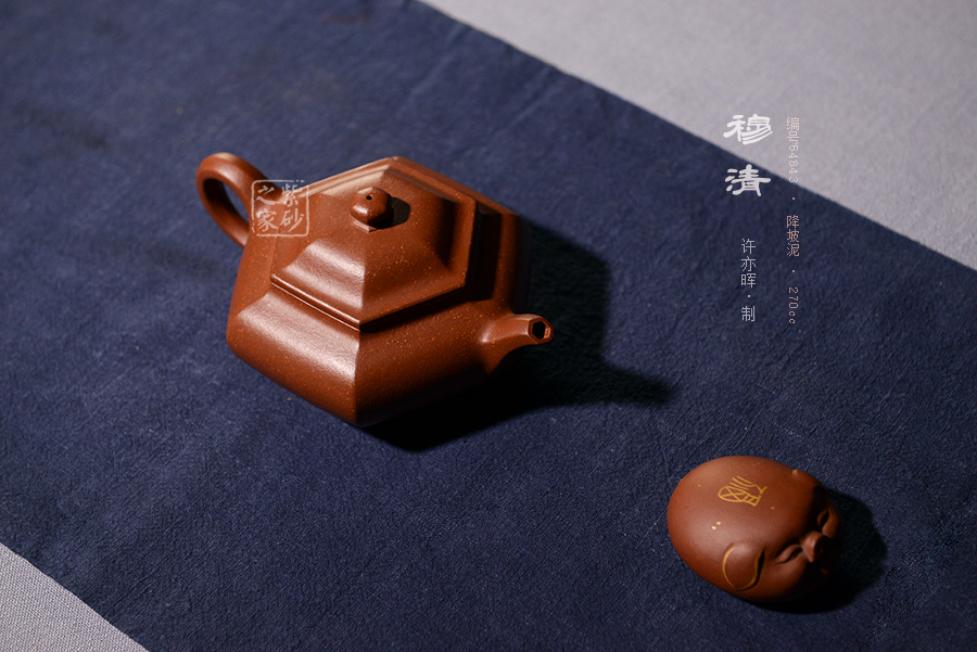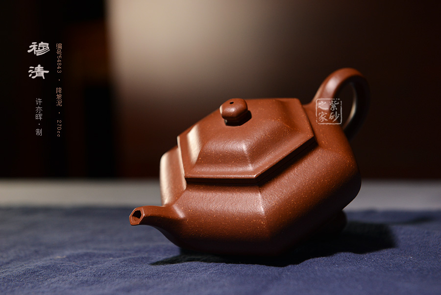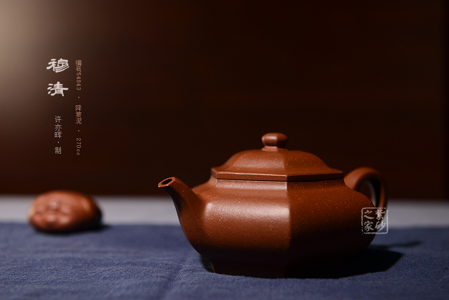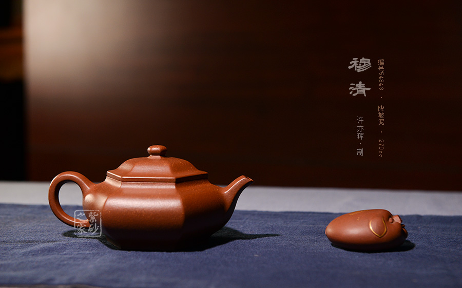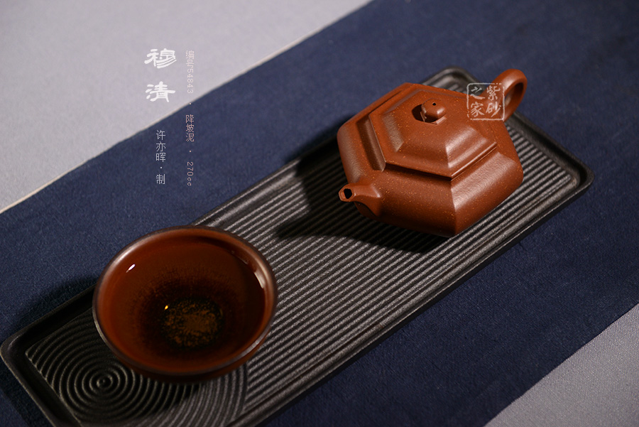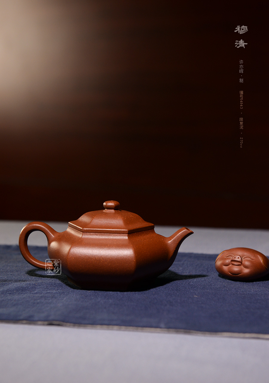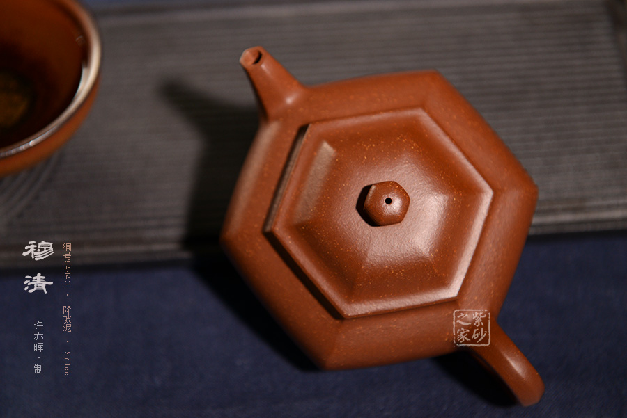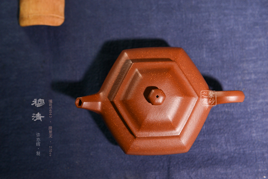 作品線(xiàn)條簡(jiǎn)潔,力度凝重,韻涵有序,渾然天成。六方成型,由鈕、蓋、口、身以至圈足皆貫以六棱,線(xiàn)條明晰工整,轉(zhuǎn)折合度。制壺手法干凈利落,成壺明快挺秀。細(xì)節(jié)刻畫(huà)清晰,方中寓圓,剛?cè)岵?jì),柔和大雅,注重藝術(shù)與人文的充分結(jié)合,營(yíng)造出素樸美好的情懷空間。相對(duì)于造型的大氣溫婉,穆清壺體上恰到好處的線(xiàn)條工藝使作品更加雋永耐看,不突兀,不累贅,使整把壺形神俱佳。