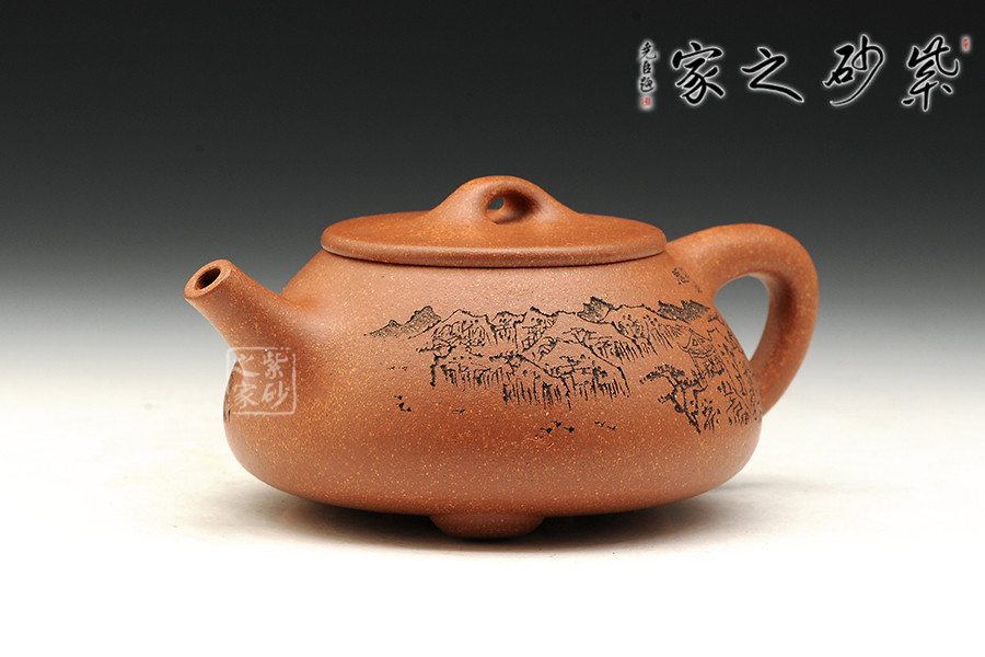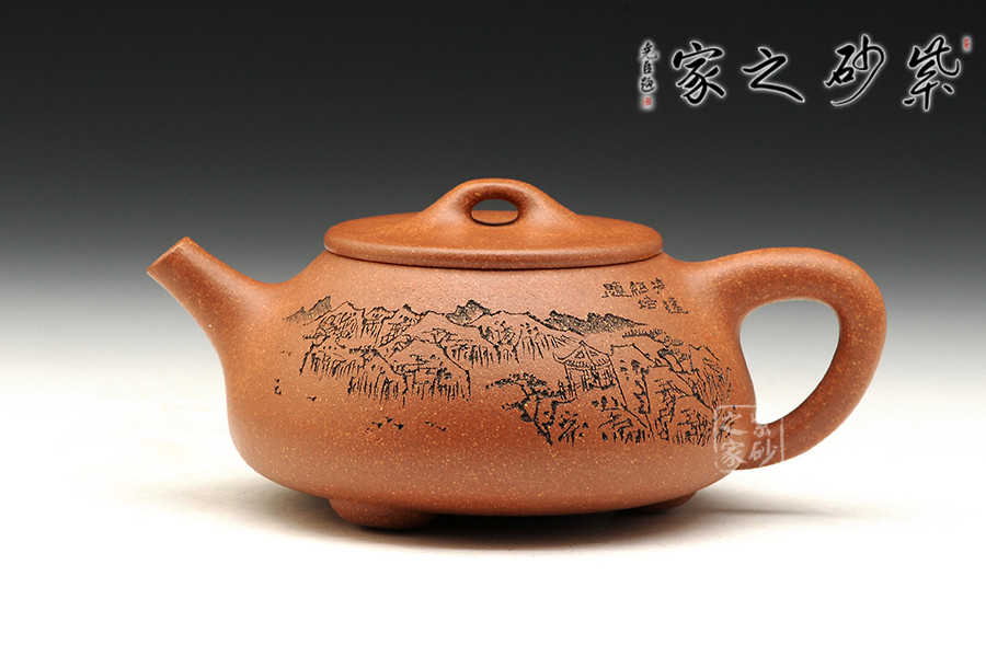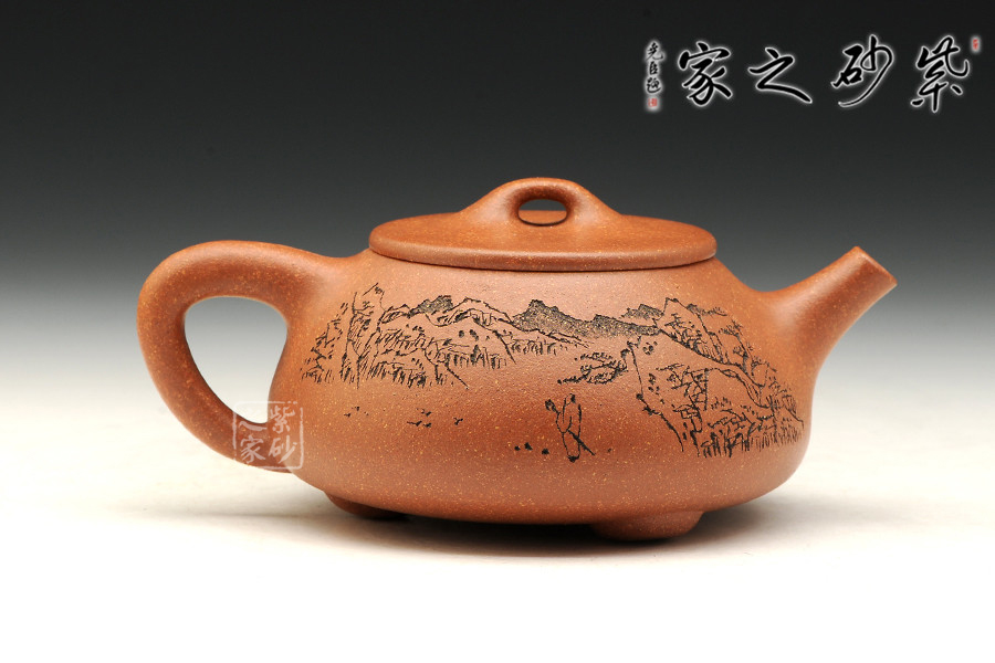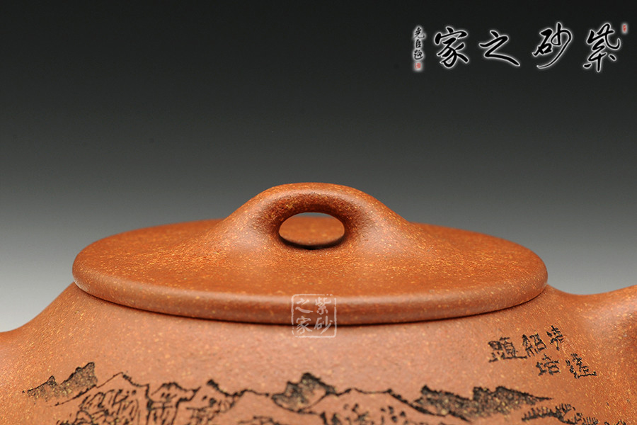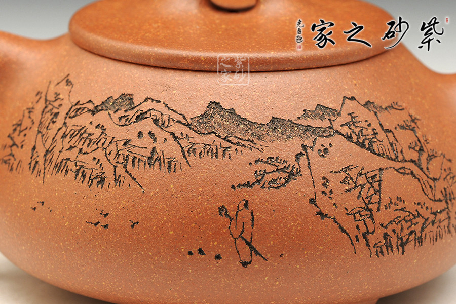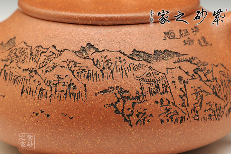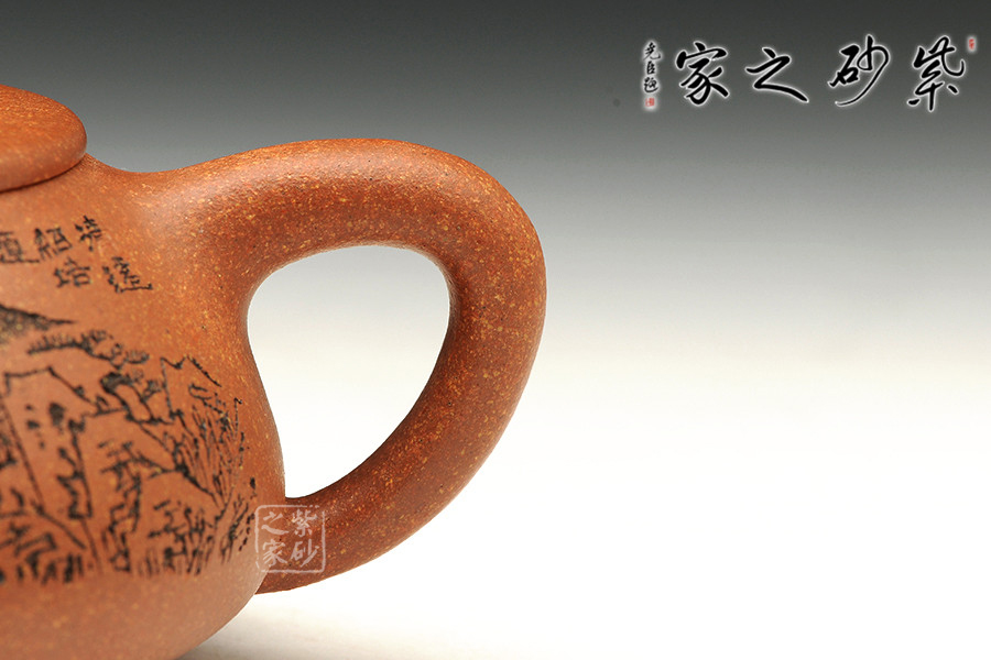 此款石瓢,工藝精湛細(xì)膩,壺蓋厚薄正好,線條圓潤(rùn),下身與口結(jié)合嚴(yán)密,口沿與蓋面的交接和順而又突出蓋板線的圓整有勁。蓋上的橋梁鈕,高矮跨度符合比例,變化較大。造型簡(jiǎn)練,古樸大方,端莊穩(wěn)重,剛中有勁,敦實(shí)調(diào)和。壺身描繪山水寓意,其意境更是耐人尋味!