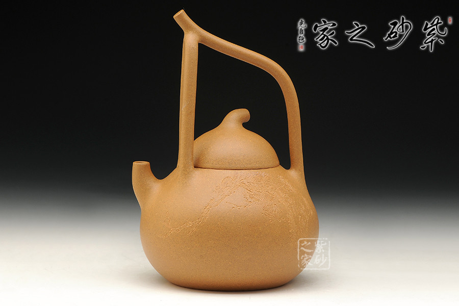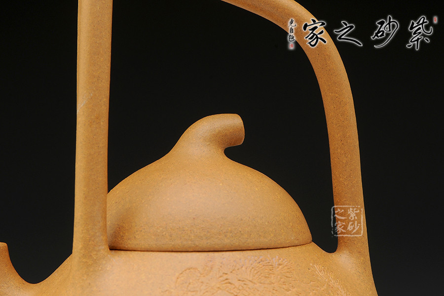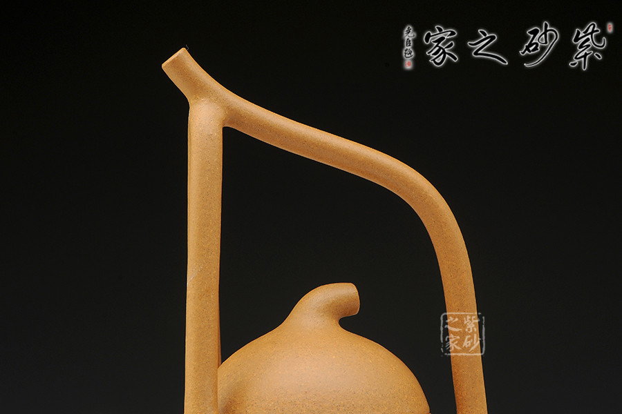 作品由經(jīng)典壺式改良而來,文人氣息比較濃,淡雅的段泥為料,與文人優(yōu)雅的氣質(zhì)極為符合。壺身以瓜狀為型,身筒圓鼓飽滿,造型敦樸;彎流憨實(shí)上揚(yáng),出水順暢;提梁由肩至上作三叉狀,把柄合手,便于提取;蓋面鼓起,鈕如瓜蒂,生動靈巧。整器圓潤豐腴,氣格渾厚。
