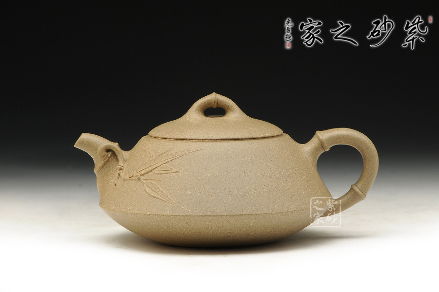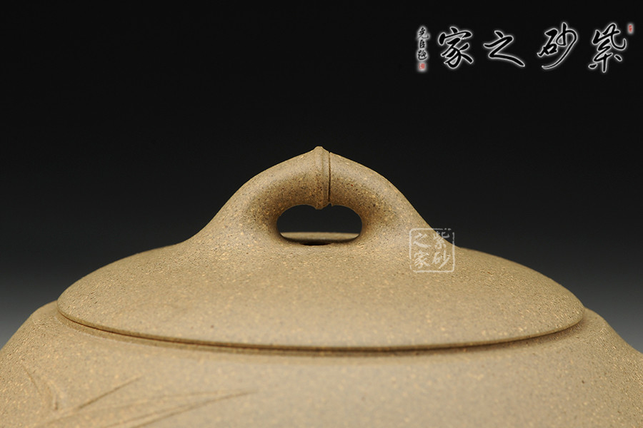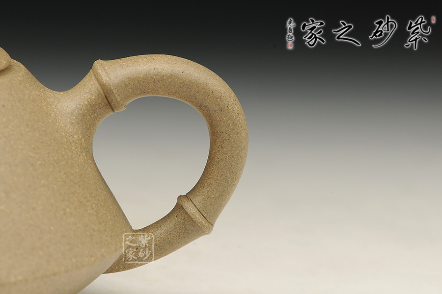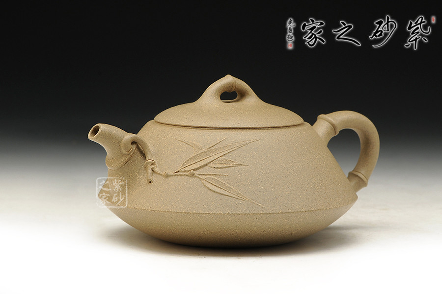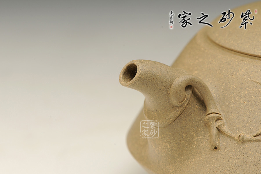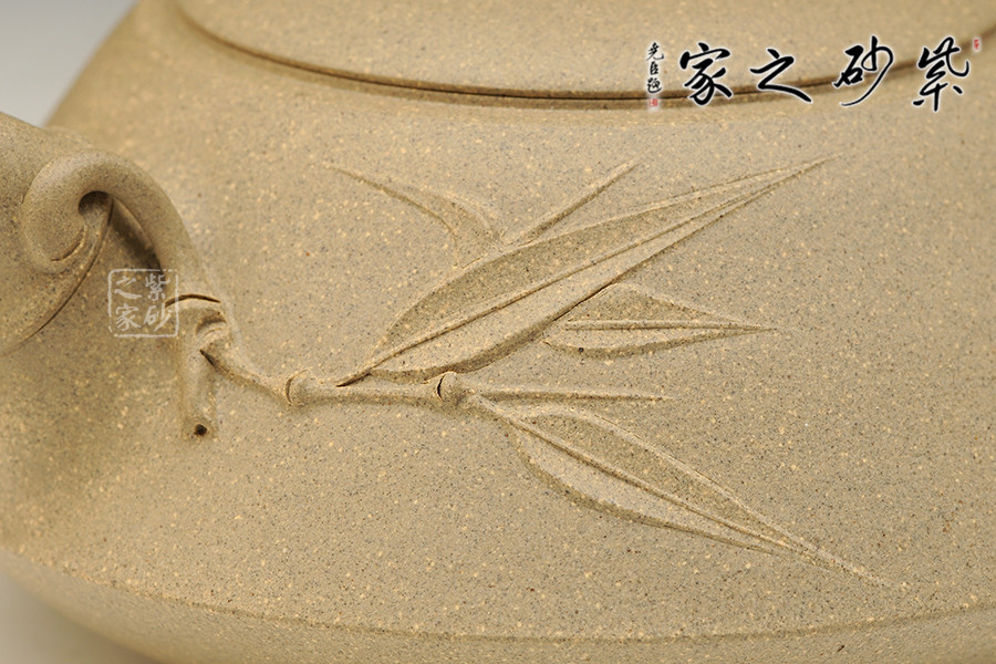此壺由上下兩形對(duì)合而成,壺身圓潤(rùn)端莊,線面屈曲和諧,剛?cè)嵯酀?jì),各個(gè)部分與主體造型緊密呼應(yīng),貫通一氣。壺嘴之胥出竹枝,清秀俊逸,搖曳生姿,清風(fēng)徐來(lái),自有竹葉迎風(fēng)而動(dòng)。以淡雅的色澤襯托清風(fēng)明月的靜謐,韻味十足。