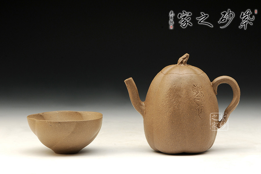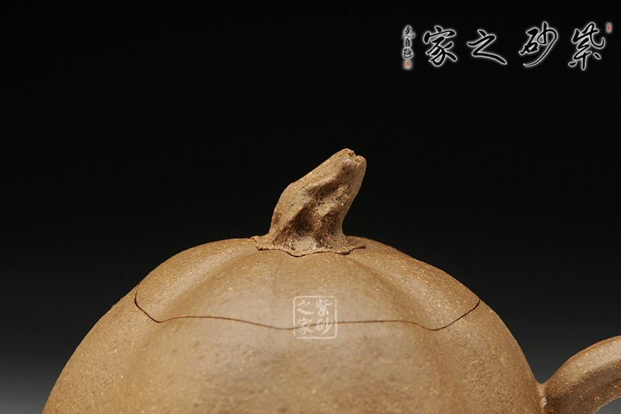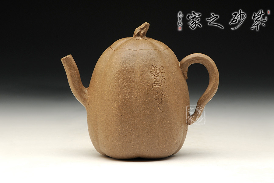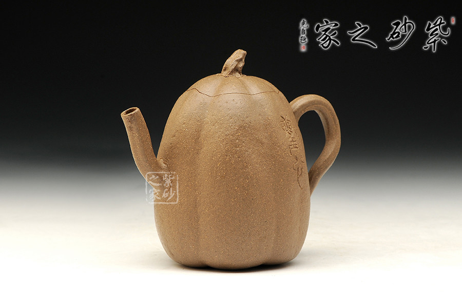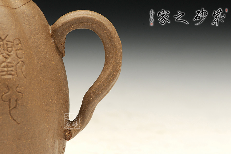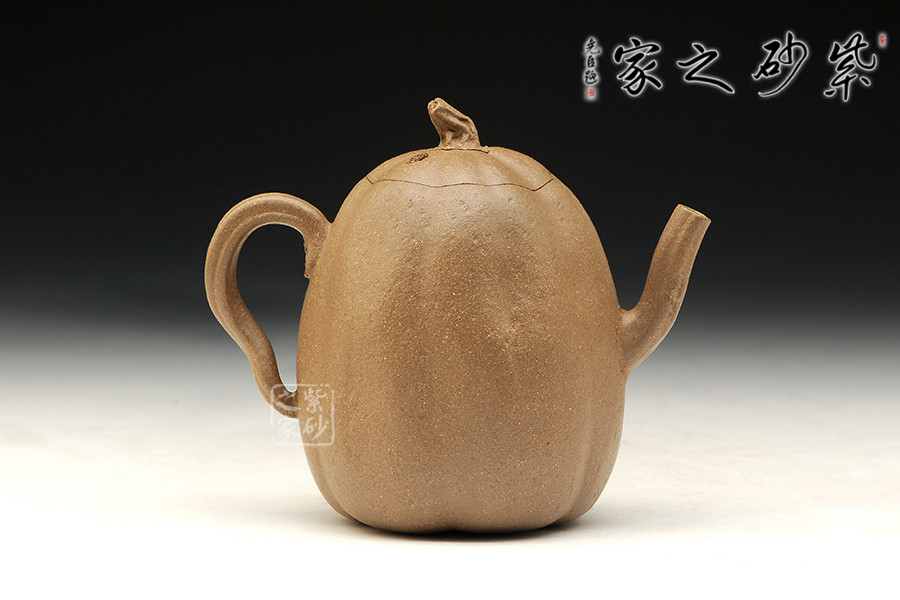中青年優(yōu)秀陶藝家莊紅陽,精于手工制壺,注重作品的原創(chuàng)性,性價比高。原礦段泥燒制溫度較難把握,溫度不夠,紫砂壺易吐黑,肌理質堅而溫潤,適合沖泡未發(fā)酵與半發(fā)酵類茶。作品形似一只落蒂青瓜,以筋紋表現(xiàn)造型,以瓜蒂瓜藤元素入壺,使壺的形象富有張力和生機。壺身微弱的瓜瓣凸凹起伏,藤絲擰成把與流,生動自然。作品貼近自然,崇尚本真,洋溢著濃郁的生活氣息,預示著生命的延續(xù)與豐收的希望。