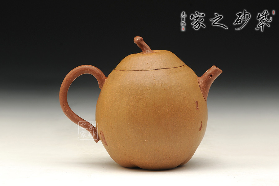 中青年優(yōu)秀陶藝家莊紅陽,精于手工制壺,注重作品的原創(chuàng)性,性價比高。原礦段泥燒制溫度較難把握,溫度不夠,紫砂壺易吐黑,肌理質堅而溫潤,適合沖泡未發(fā)酵與半發(fā)酵類茶。塑器本身似一只香味四溢的梨子,別致精巧,形象逼真。初觀此器,溫文爾雅,壺身與壺蓋渾然一體,形似香梨,其成色亦十分近似。嘴、把、鈕則以梨枝塑之,內蘊自然之趣。老師以雙色泥制作,其成型難度翻倍,作品預示著秋收之時豐收的喜悅。