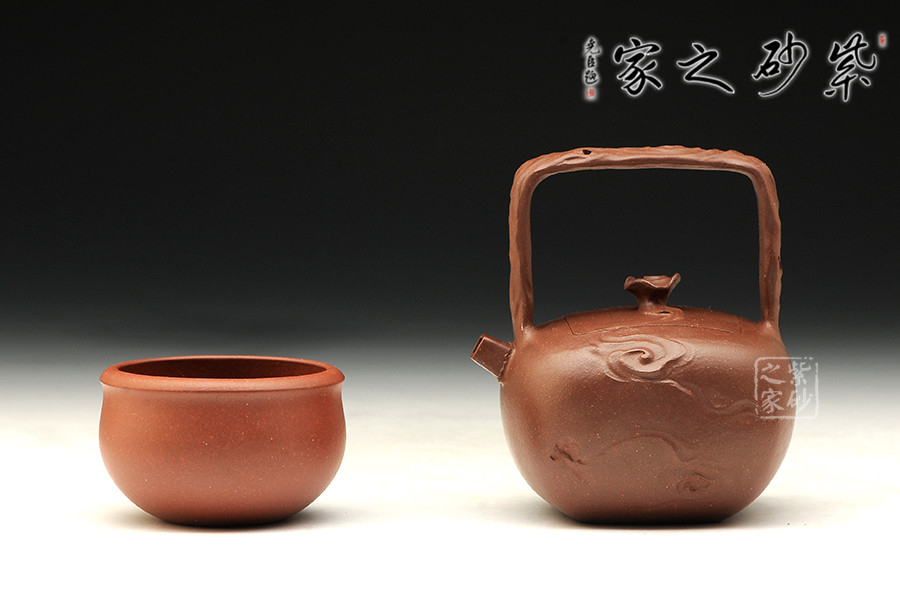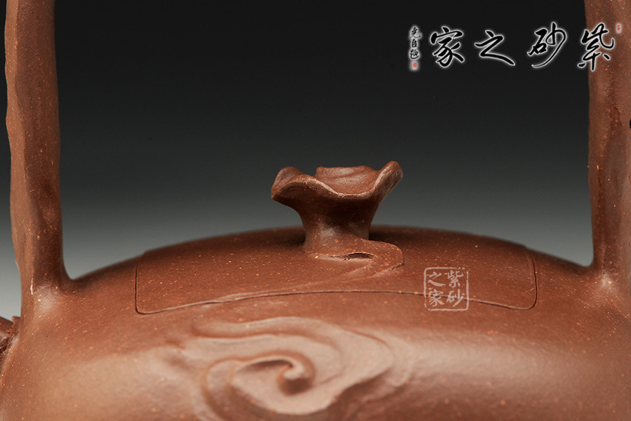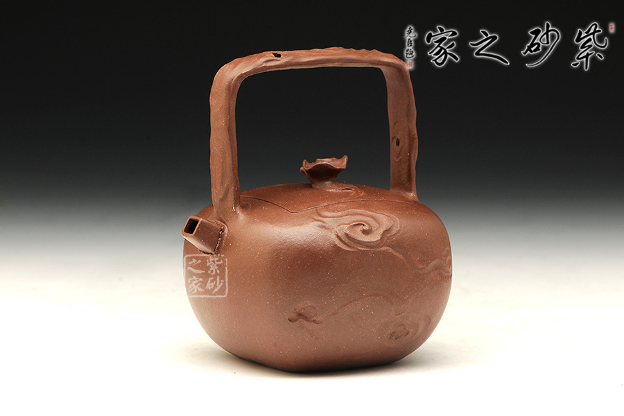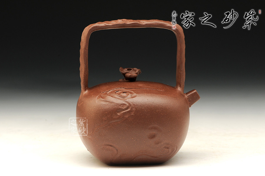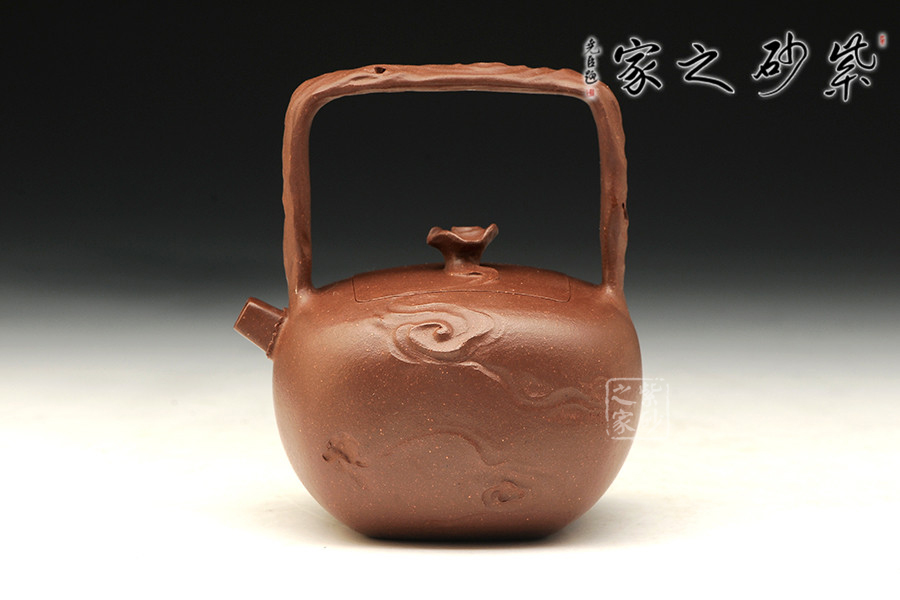 中青年優(yōu)秀陶藝家莊紅陽,精于手工制壺,注重作品的原創(chuàng)性,性價比高。優(yōu)質(zhì)泥料原礦紫泥手工成型,端莊肅穆,有富貴雍容之氣。器精美絕倫,而且能夠在泥色的襯托下呈悠然,作者將“祥云”紋理刻畫得滑若絲綢,看似無型卻有型。嵌蓋設(shè)計(jì),嚴(yán)絲合縫,壺蓋與壺身融為一體,壺嘴直流向上延伸,提梁把尤如祥云纏繞,紋路走向看似恣意隨性,實(shí)則皆有規(guī)矩法度,細(xì)節(jié)之處到處可見造型的巧思和工藝的老辣,整個作品有吉祥美意。
