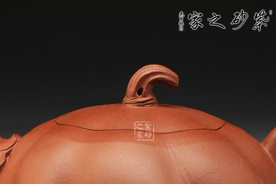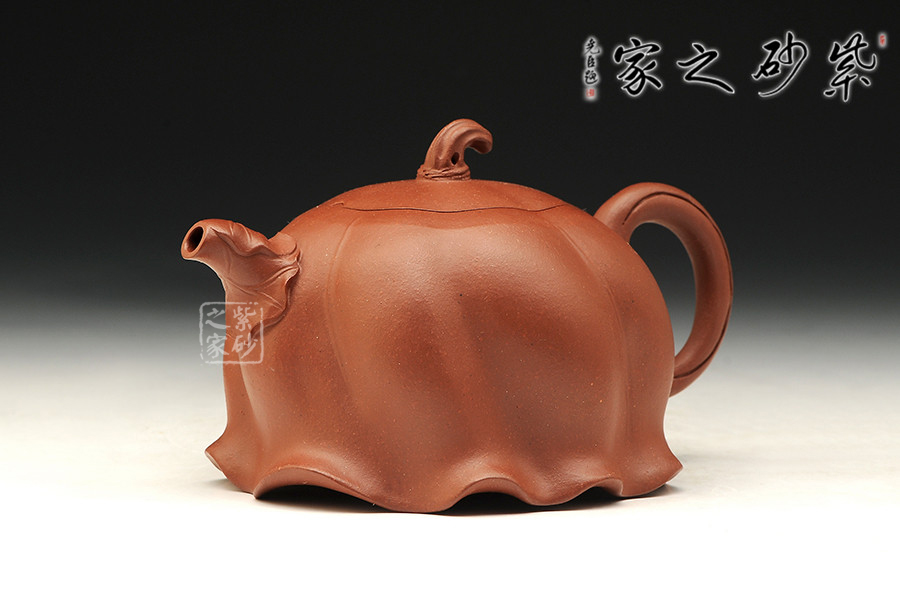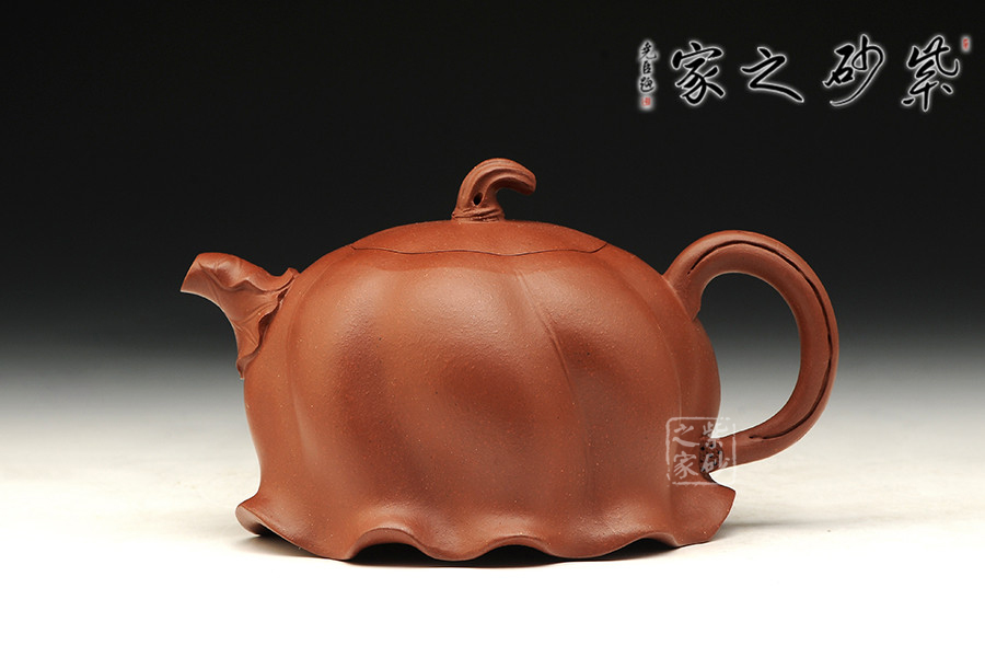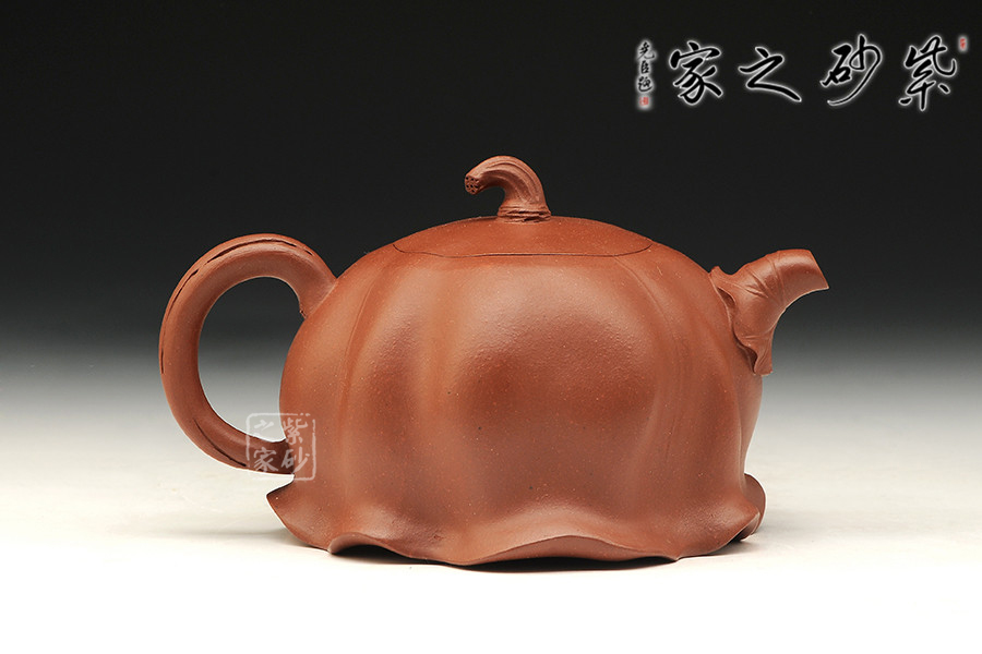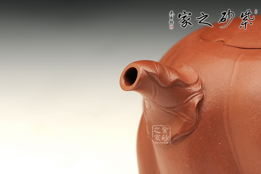 中青年優(yōu)秀陶藝家莊紅陽,精于手工制壺,注重作品的原創(chuàng)性,性價比高。收縮比相對較大的紅泥手工成型,泥色驚艷溫潤,以紅泥制作花器成型難度較大。整器造型仿生逼真,線條輕盈流暢,無一處細節(jié)不體現(xiàn)出作者的用心透徹。整器筋紋紋肌理處理得當,截蓋設計,以蒂作鈕,整壺形似一片微斂的荷葉,清清自然;壺嘴以荷葉蜷曲包裹而成,荷梗作端把。整壺器形新穎別致,氣質清雅,而荷音同“和”,荷合之壺,寓意和和美美,合家歡樂。