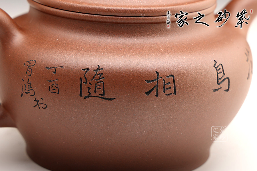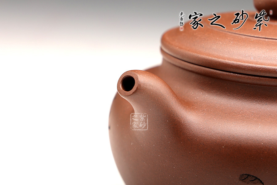 福圓顧名思義,聚德聚福,德行高尚,福運(yùn)綿延之意。此壺造型亦是如此,壺身極為飽滿柔和,仿若下一刻就要怒放的花朵,滿腹的花香與福運(yùn)就要噴薄而出;壺口開闊而平整,平蓋設(shè)計(jì)同樣呈圓鼓之形,子母線嚴(yán)絲合縫,不留一絲縫隙地;壺鈕呈葫蘆狀態(tài),與佛相關(guān),實(shí)為聚德;壺嘴暗接,壺基豐厚,如青鳥出林,銜福而至。