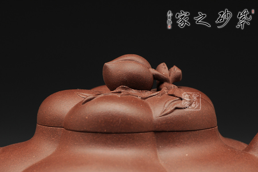 此壺為筋紋式,壺體較飽滿,壺身分為五瓣筋囊,等分均勻。線條頗具張力,囊塊飽滿,壺蓋與身密合,壺流一彎,出水流暢;壺把從囊凹處舒展而出,強化形體的平衡感;蓋鈕以捏塑手法摶成小桃及小枝桃葉,形體逼真。泥色素雅,簡潔生動,表現(xiàn)出紫砂花貨藝術(shù)的細膩精致。桃子歷有長壽之意,吉祥之寓自然不言而喻。