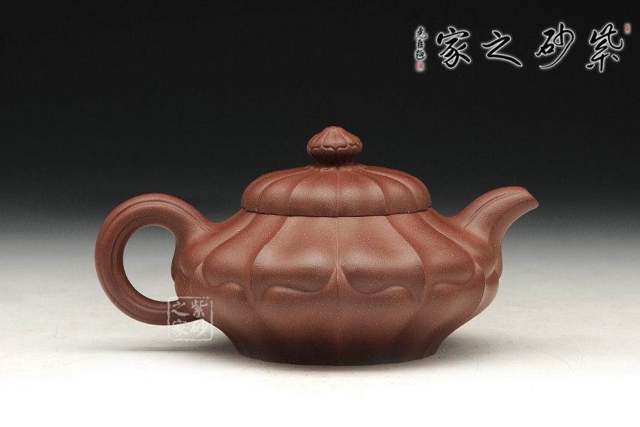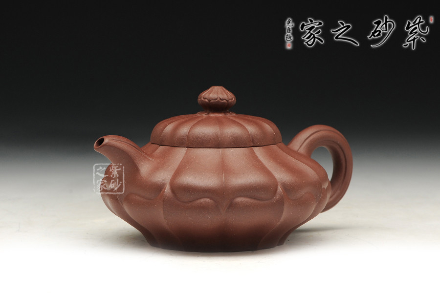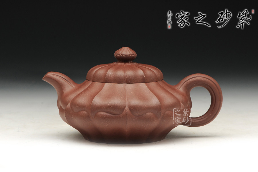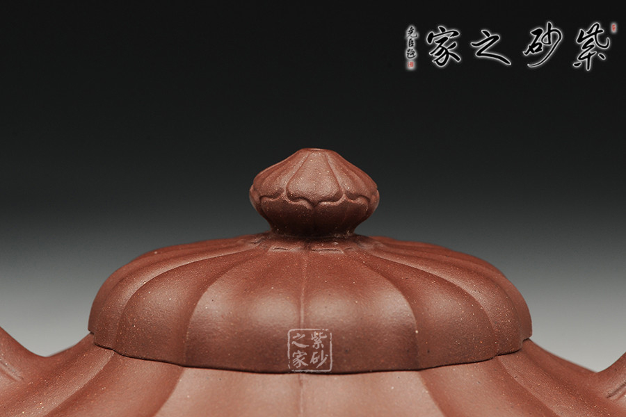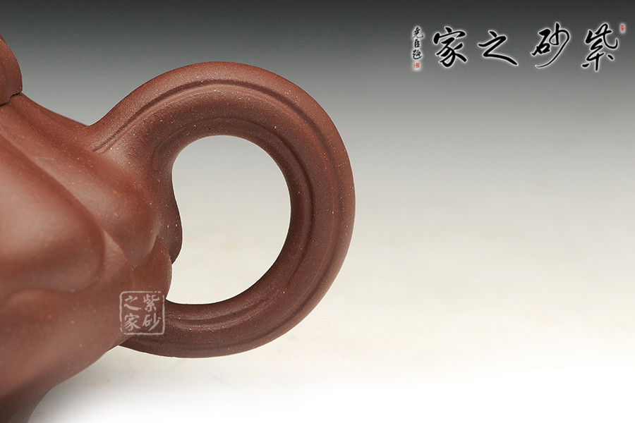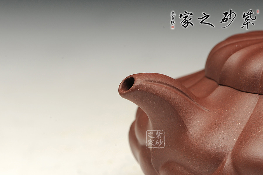 縱觀該壺,筋紋紋路明理清晰,筋紋凹凸有致,精細(xì)規(guī)整,氣勢挺拔貫通。整個(gè)外形猶若一個(gè)蓮花欲綻開,給觀賞者開啟了一個(gè)想象空間:蓮花坐墊上,青燈古佛旁,生命存在的真滴,生命輪回的規(guī)律,似乎因此有所頓悟。此壺,呈筋條狀彎成的端把和出水爽利的壺嘴,對比鮮明,更襯托了壺的俊朗挺拔之氣質(zhì);壺鈕仿若一個(gè)含苞待放的玉蕾,精致有型,新穎別致。