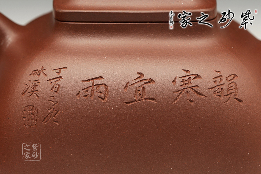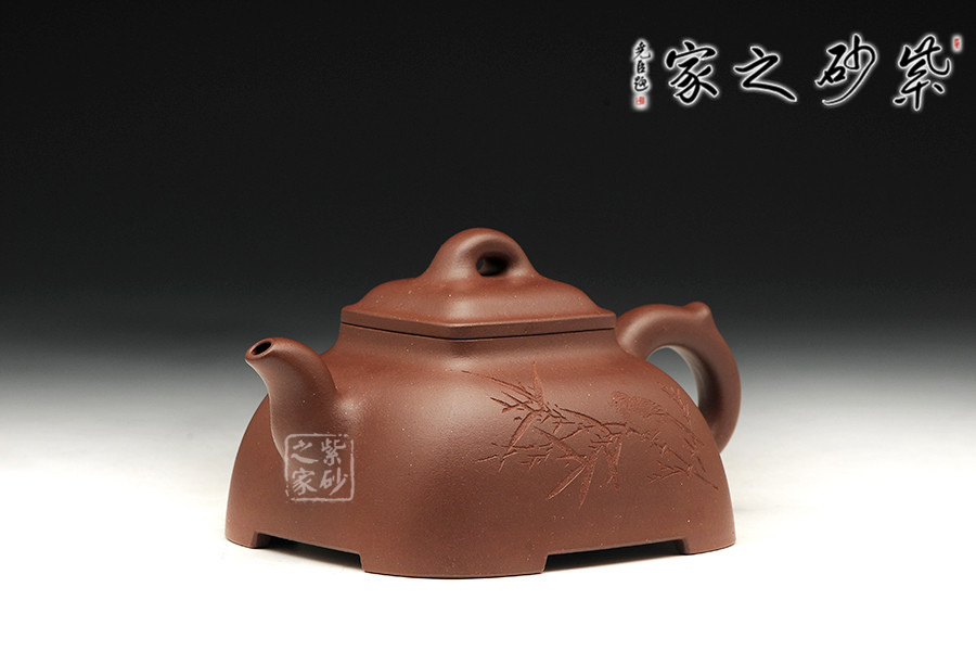 作品為傳統(tǒng)壺式,以底槽青為料,泥色溫潤古樸,透出古拙典雅,壺把拿捏舒適。壺形底方肩渾,下寬上收,穩(wěn)重而雅致。至頸項與口沿交接處再度渾方。橋梁形壺鈕簡潔大方。四方足托空壺體,呈虛空感,流二彎順胥,把耳孔與壺身協(xié)調(diào)一致。線面流暢,菱角清晰而圓渾,適宜把玩。內(nèi)外處理干凈利索,精工細作,嚴謹而不失古韻。