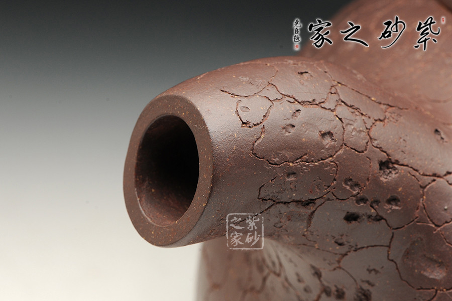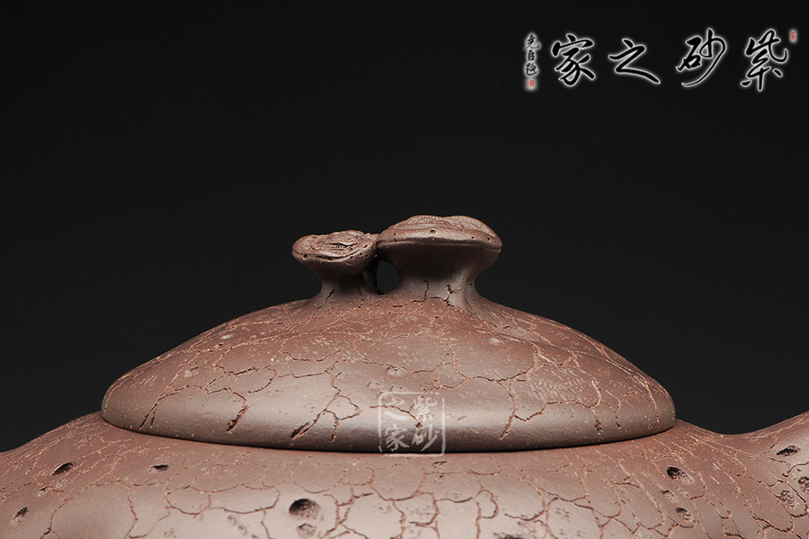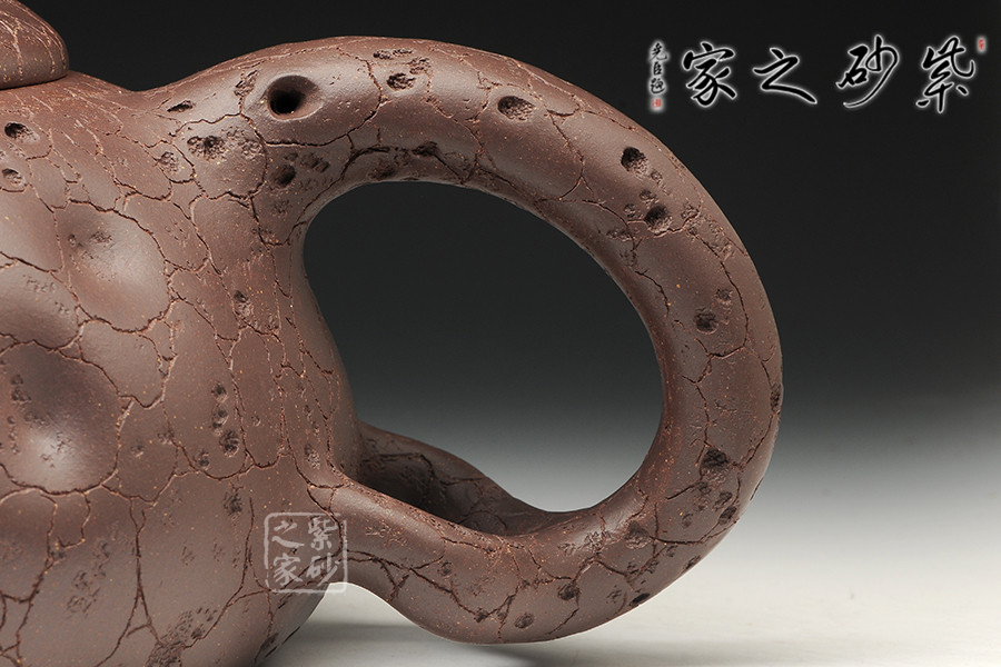 此為一款超大品紫砂作品,容量高達3600cc,手工制作,如此大品其手工難度可想而知,需耗時月余方可完成。將形態(tài)枯萎的樹化為壺,大有返璞歸真之意境。取枯老之樹為形,樹皮斑駁滿身,表面凸凹不平,卻盡顯端莊清雅,樸質(zhì)古拙。截蓋設(shè)計與壺身融為一體,氣密性良好;壺嘴與壺把對應(yīng),也是做工極佳,將枯樹的形態(tài)表現(xiàn)得淋漓盡致,雖是枯木卻也令人感受到了生命的強大。
