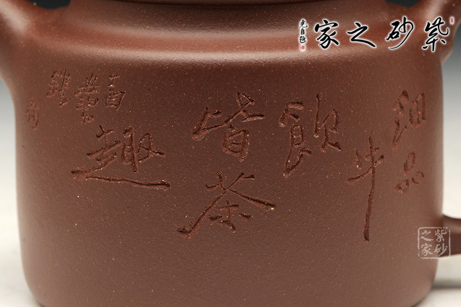 器形端莊穩(wěn)重、比例協(xié)調(diào)、結(jié)構(gòu)嚴(yán)謹(jǐn),乃經(jīng)典壺式之一。與一般德鐘壺型相較較高,壺體呈高圓柱形,肩部向上收于圓頸圓口;平蓋壓于壺口,較為合度;大耳形壺把,直流。全器泥色沉穩(wěn),意態(tài)樸雅,古風(fēng)遺韻。通體觀之,器古文美,頗顯古雅之意味。