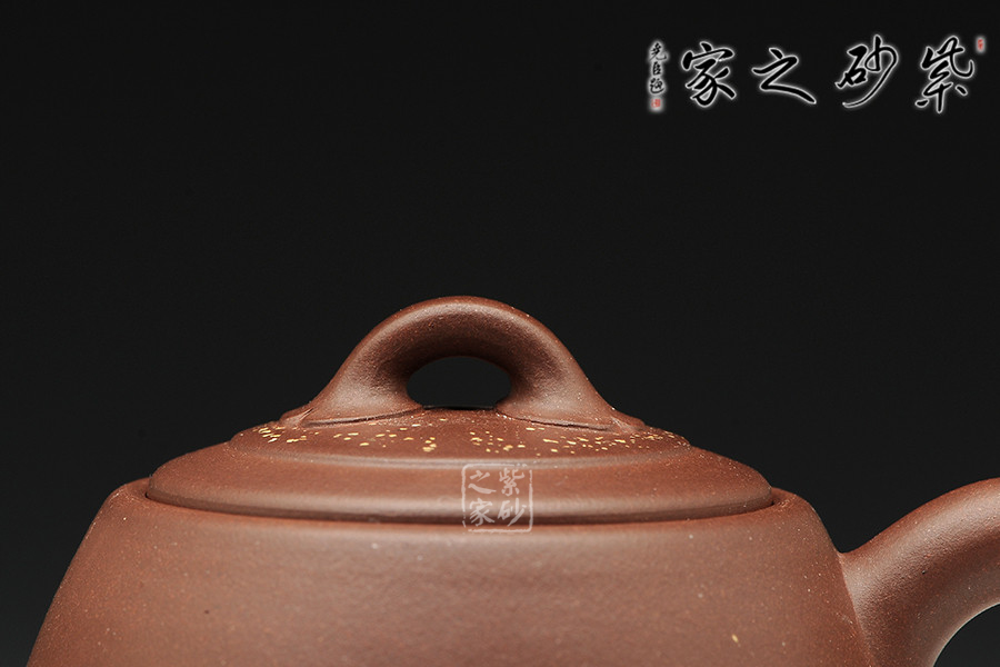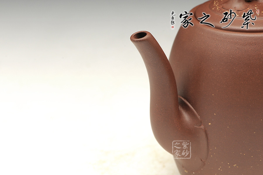 器型圓滑修長,線韻簡練有致,如佳人亭亭玉立,清心凝神,靜穩(wěn)沉著。壺流自腹部明接胥出,優(yōu)雅勻稱,搭配大圈把,自呈一派天光水色。整件作品以長短不等的曲線塑形,神韻超逸,壺蓋及壺身點(diǎn)點(diǎn)金砂,如黃花匝地,紛紛揚(yáng)揚(yáng),以精工佐其古雅。作品雖氣勢宏偉而無霸悍之氣,結(jié)構(gòu)嚴(yán)謹(jǐn)卻不失空靈之美。“黛怨紅羞掩映,畫堂春欲暮”,如晚清仕女畫中輕靈淡雅、娟秀婀娜。