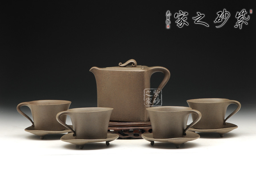紫砂界中青年實(shí)力派陶手手制,此作品一壺四杯四碟,選用青灰段泥精制而成,泥色溫潤(rùn)。壺、杯、碟以“三角”理念設(shè)計(jì),三是個(gè)有特殊意義的造型,三而圍合,有和意,合而為茶,交集處,吐之如“泉”。故此套壺命名為妙泉。壺身呈三角柱狀體,短流、耳廓把,把末梢?guī)эw;嵌蓋式,如意水波紋鈕。此茶具套組設(shè)計(jì)巧妙、線條流暢、制作精良。