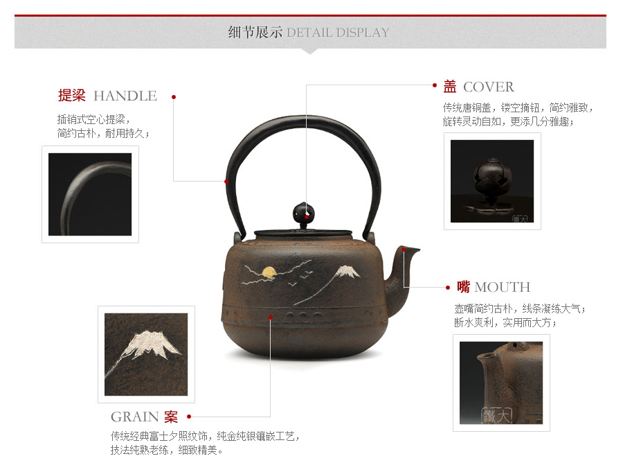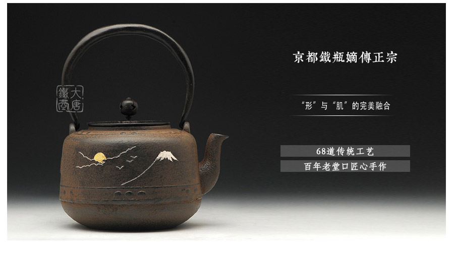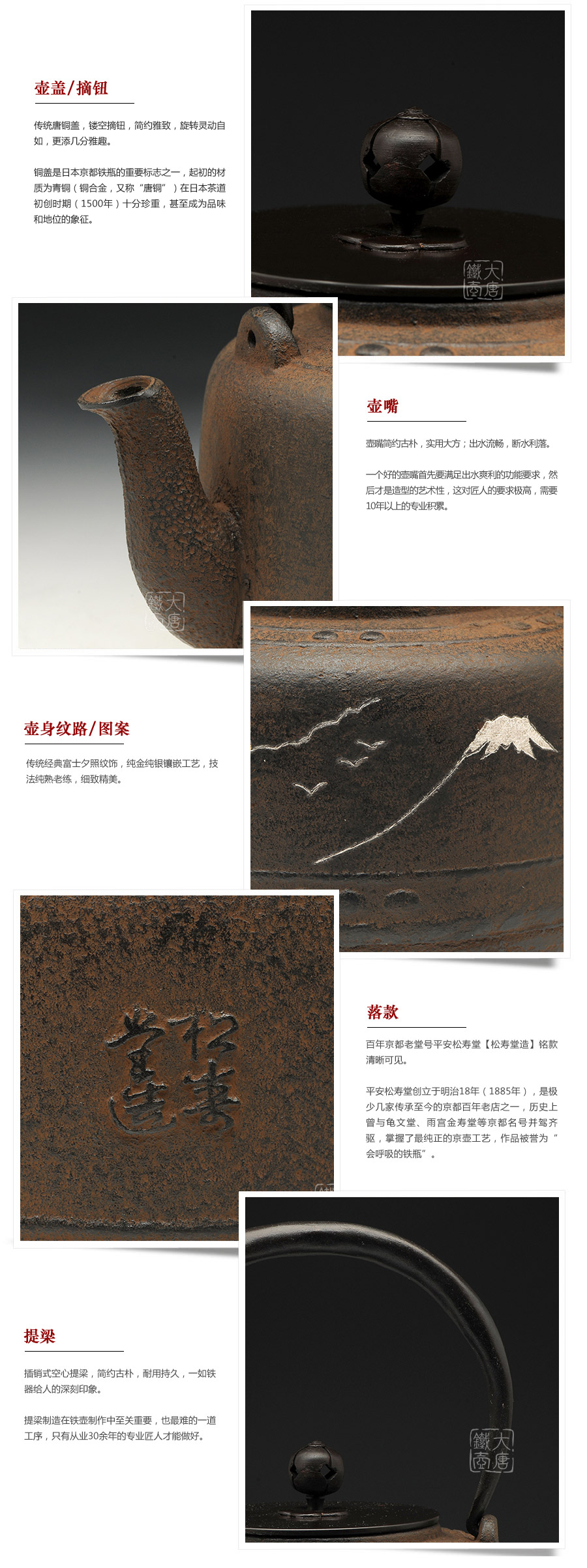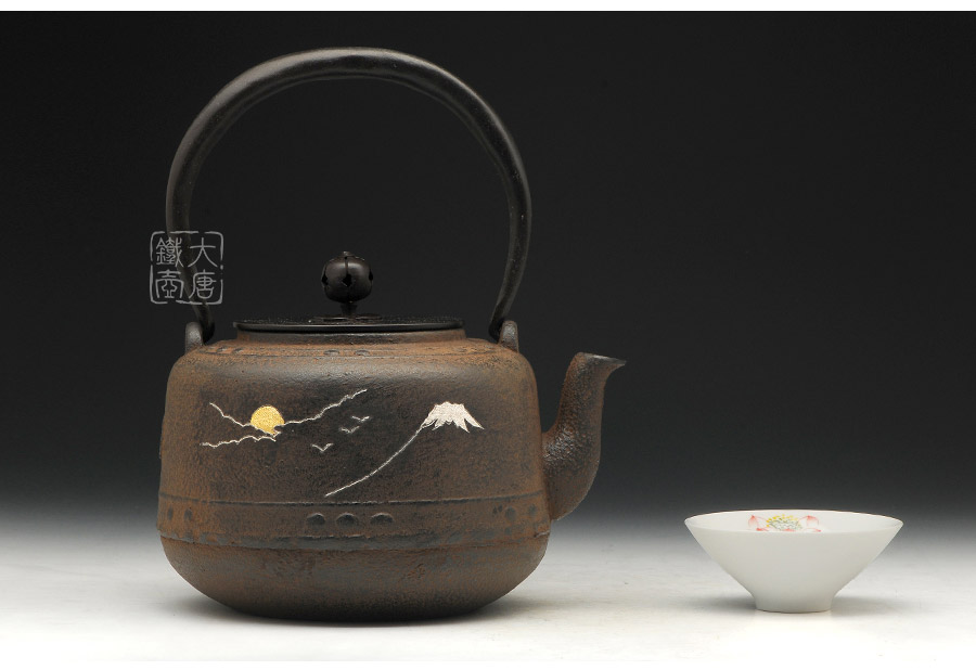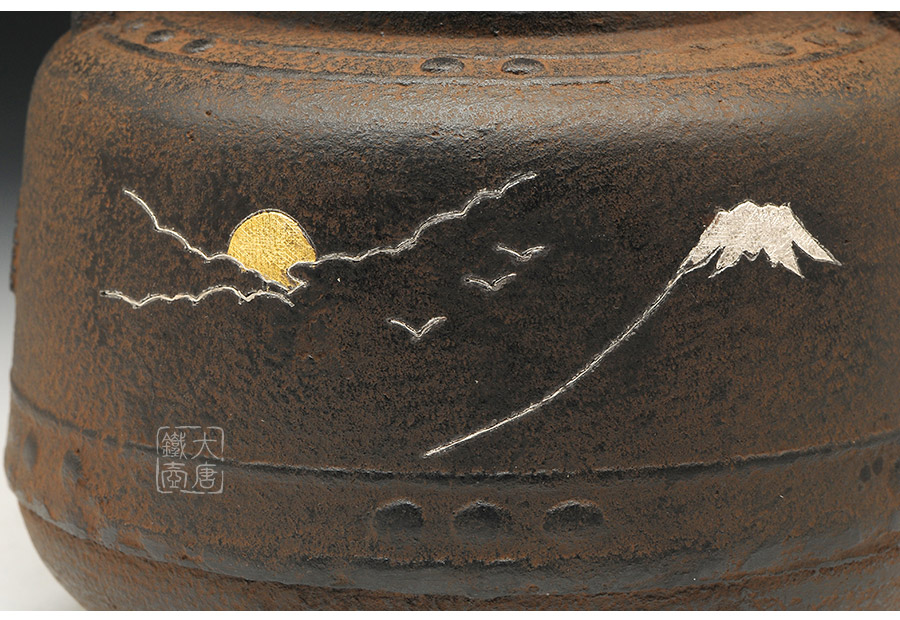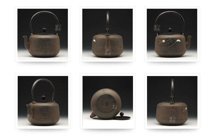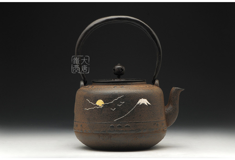 平安松壽堂匠心之作,經(jīng)典萬代屋型,富士夕照山景紋, 純金純銀鑲嵌,搭配傳統(tǒng)銅蓋,鳴金壺底,美觀持重。