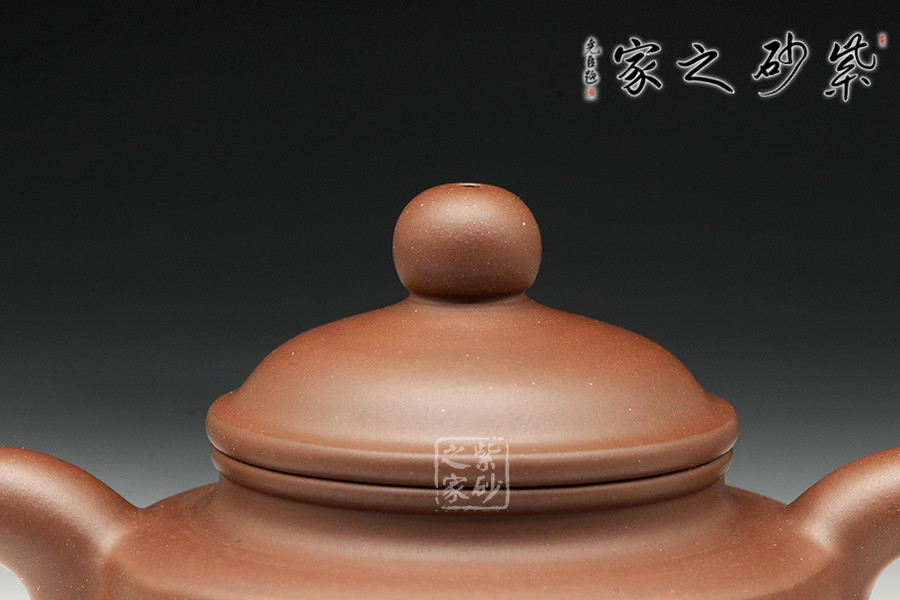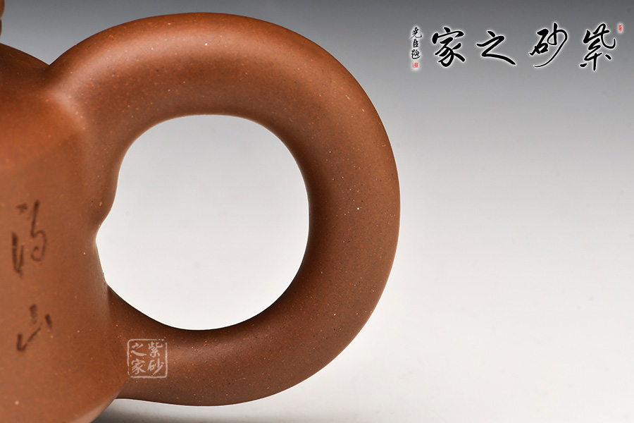 壺身線條飽滿,輪廓柔和,如同水中長年累月打磨過的石頭。壺底加圈足,和壺頸部上下對應(yīng),優(yōu)雅氣韻由此頓生;壺蓋飽滿圓潤,如一滴晃動的墨水;蓋上的圓珠壺鈕圓滑可愛,精妙可人;壺把的壺嘴的線條非常明朗,與壺身相比似有些過于清晰,但正是因此,此壺特別的味道才更加濃厚。