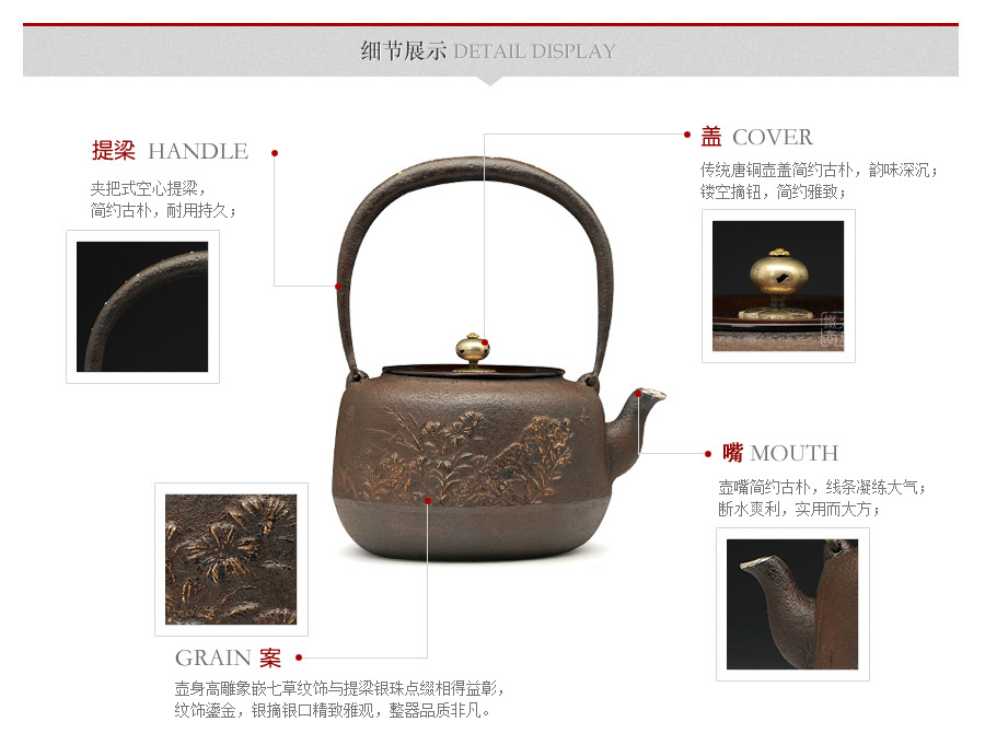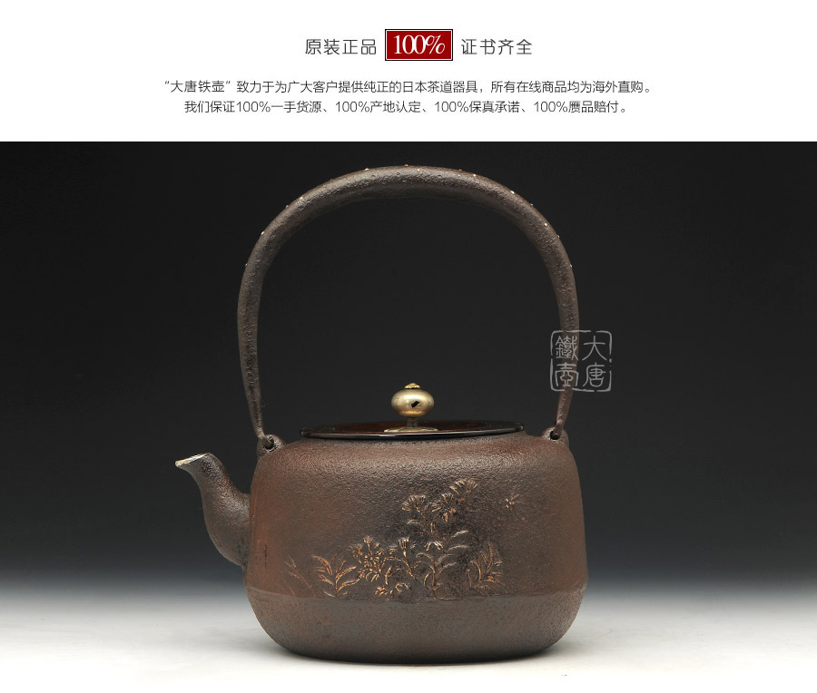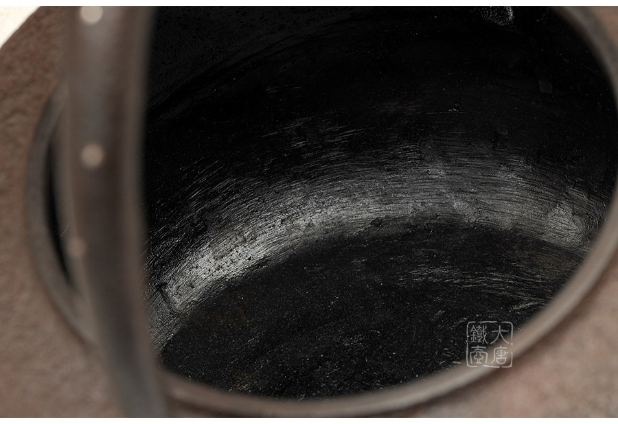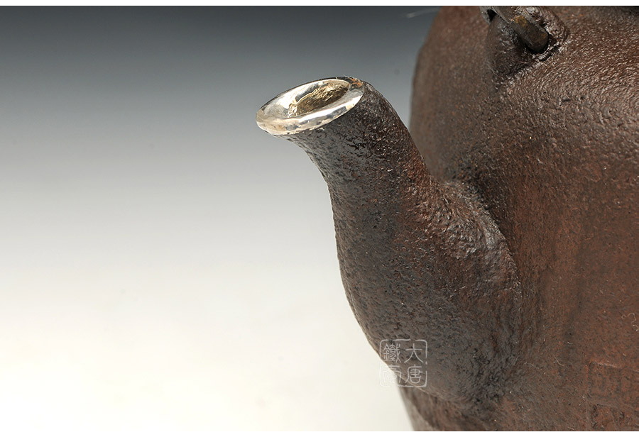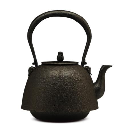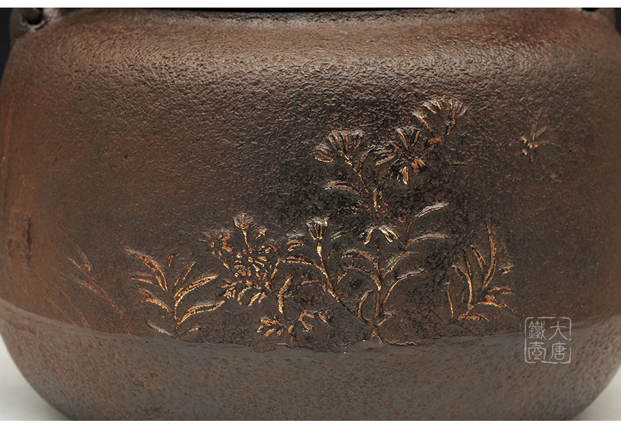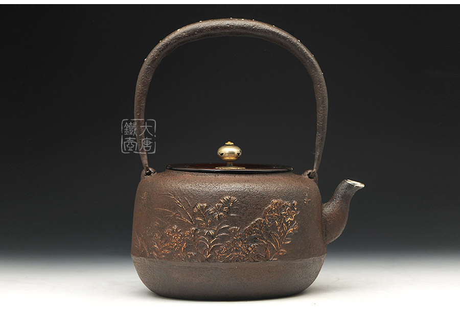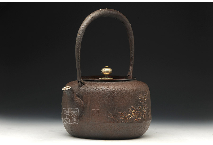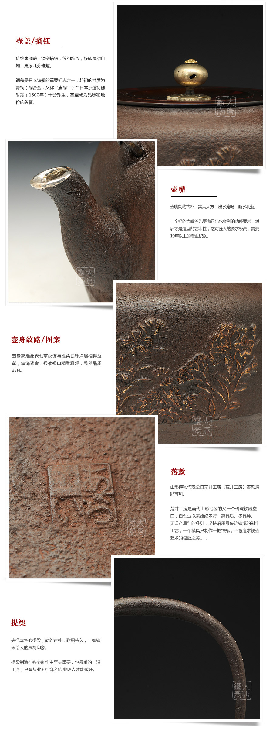 山形鑄物傳統(tǒng)鑄造工藝,一模一具,純手工蠟鑄成型。壺身高雕象嵌七草紋飾與提梁銀珠點(diǎn)綴相得益彰,紋飾鎏金,銀摘銀口精致雅觀,整器品質(zhì)非凡。