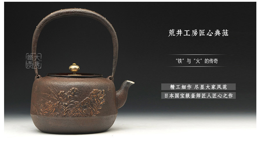 為了追求更為精致的紋理和細(xì)節(jié),當(dāng)代堂主荒井干雄孜孜不倦的將全部精力投入鐵瓶的創(chuàng)作之中,每一作品都經(jīng)由精心醞釀,純手工精心制作,不僅將荒井一家的祖?zhèn)骷妓嚢l(fā)揚(yáng)光大,同時(shí)也在鐵瓶界闖出了自己的名聲,成為當(dāng)代的釜師名家。