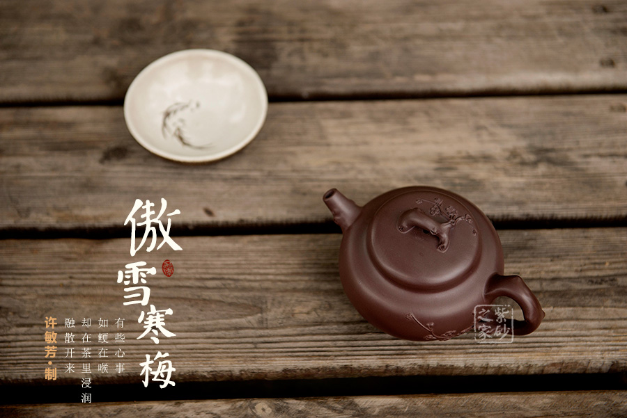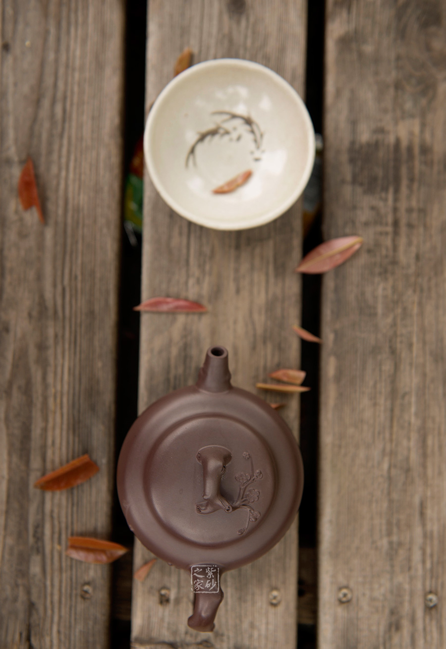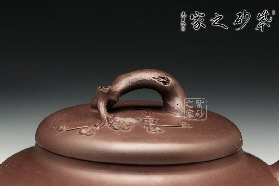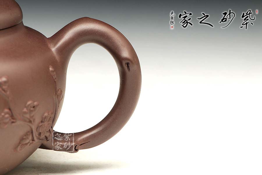 原礦紫泥為料,靜穆的色澤與梅獨(dú)守寒冬的低調(diào)非常契合。壺身豐腴飽滿,肩線挺括,,的流把、壺嘴與壺鈕皆以梅枝為形制作,虬曲的枝干上少不了疤結(jié)作為點(diǎn)綴,雅致之外多幾分滄桑厚重的老味。一條梅枝自壺把與壺身銜接處胥出,一朵梅花盛開在枝頭,更多的花骨朵含苞待放,清新之外更多幾分含蓄之美,內(nèi)蘊(yùn)深厚,耐人尋味……