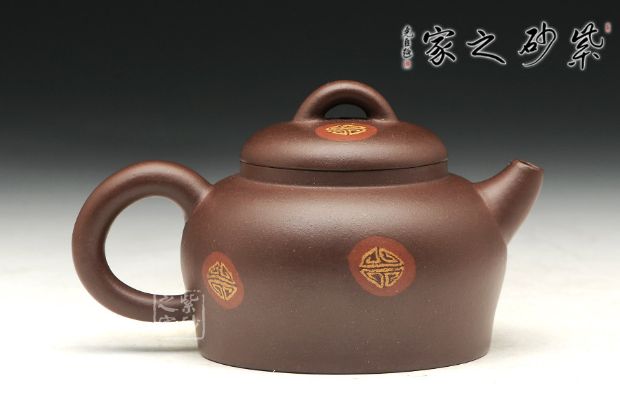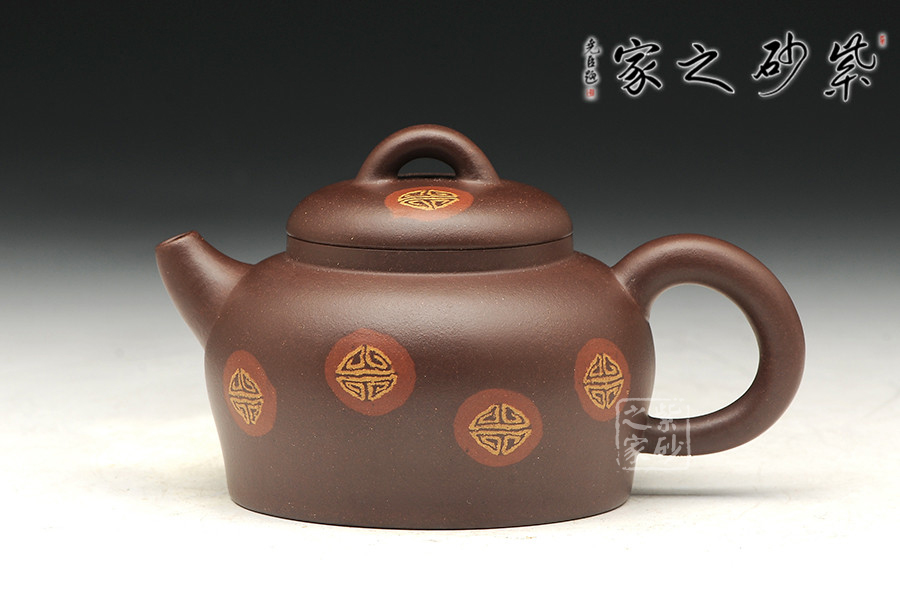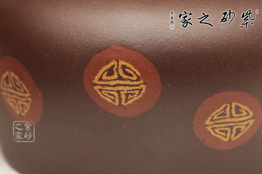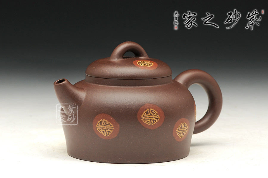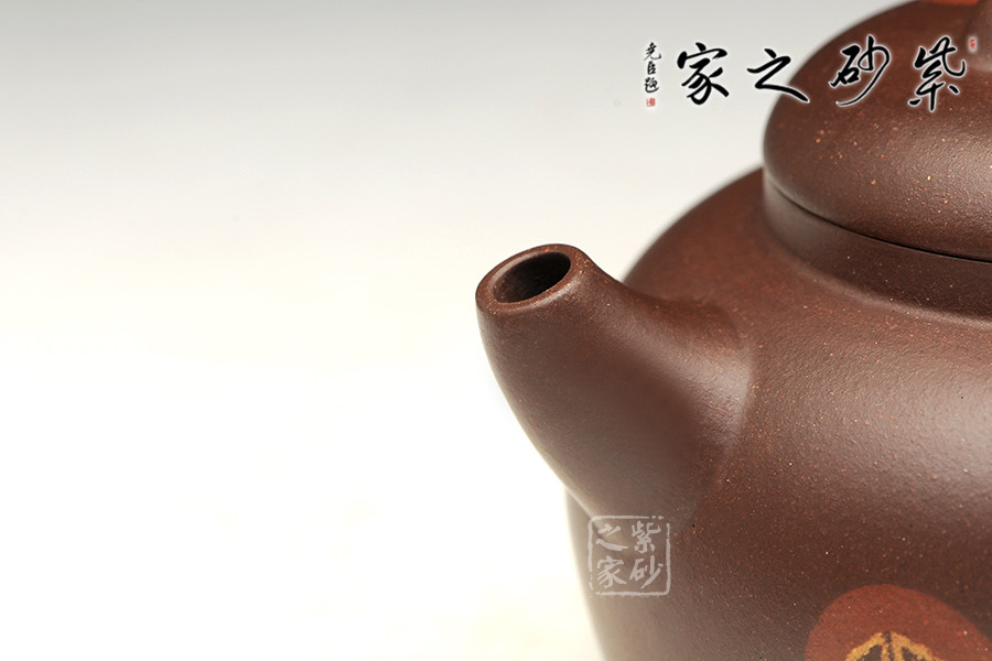該壺名為得福,俗話之養(yǎng)怡之福,可得永年,吉祥祝福之意盡在壺中,福氣滿貫。此壺壺肩圓闊,線條流暢在壺底收攏,平底敦實(shí)穩(wěn)重。一彎流朝上,福氣沖天,耳把挺拔,壺蓋鼓起,拱形鈕壓陣,整壺形似秤砣,有承載福氣,矯捷穩(wěn)健之勢(shì)。壺身絞泥紋飾,添福添壽,值得推薦。