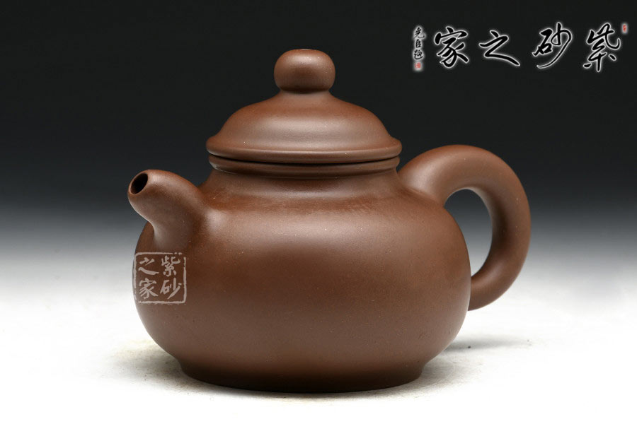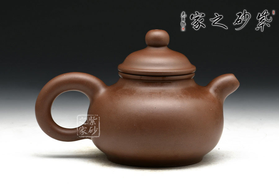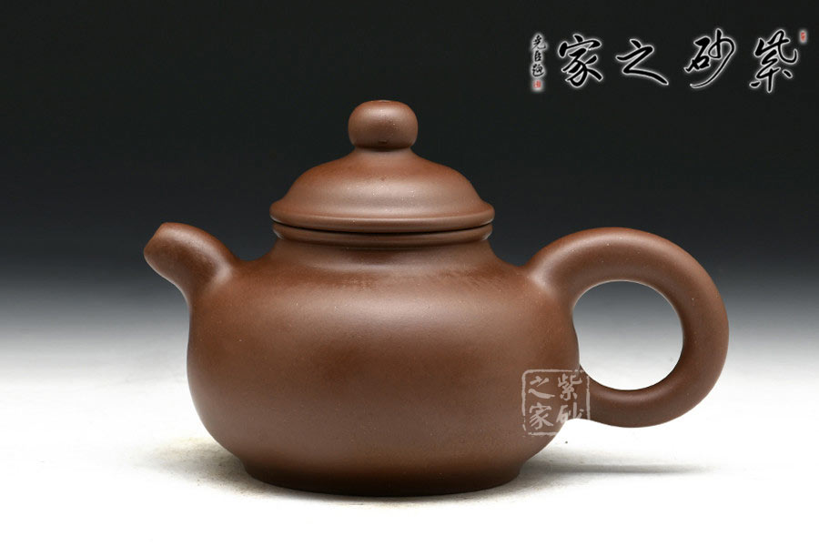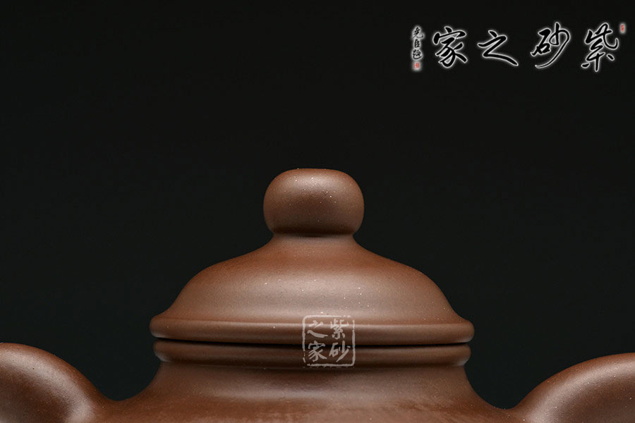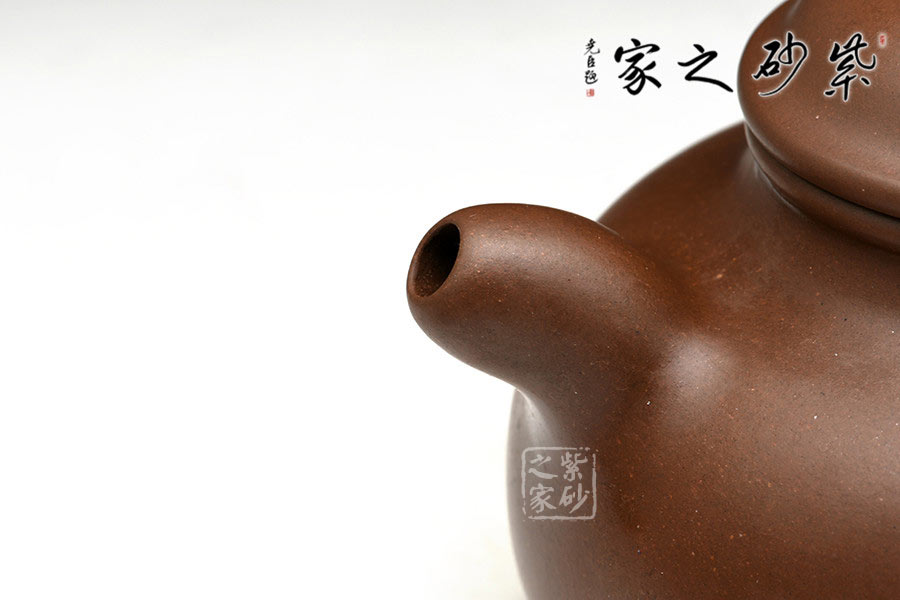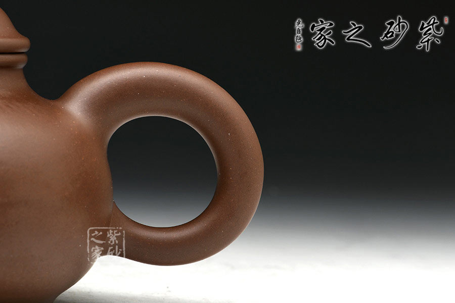 作品以老師獨家配制的羊脂泥全手工制作,泥質細膩,成色穩(wěn)重,易養(yǎng)成。此壺造型小巧美妙,精工細致,讓人把玩欲罷不能。壺身扁圓可愛,輪廓明朗,圈足和壺頸上下對應,美感頓生。壓蓋的子母線對仗工整,嚴絲合縫。珠型壺鈕由鼓蓋拱衛(wèi),精巧圓滑,似稀世珍寶。壺嘴和壺把渾圓短粗,氣質沉穩(wěn),非常有古典的韻味。通身來看,此壺之精妙寓巧于拙,越是把玩越覺韻味無窮。