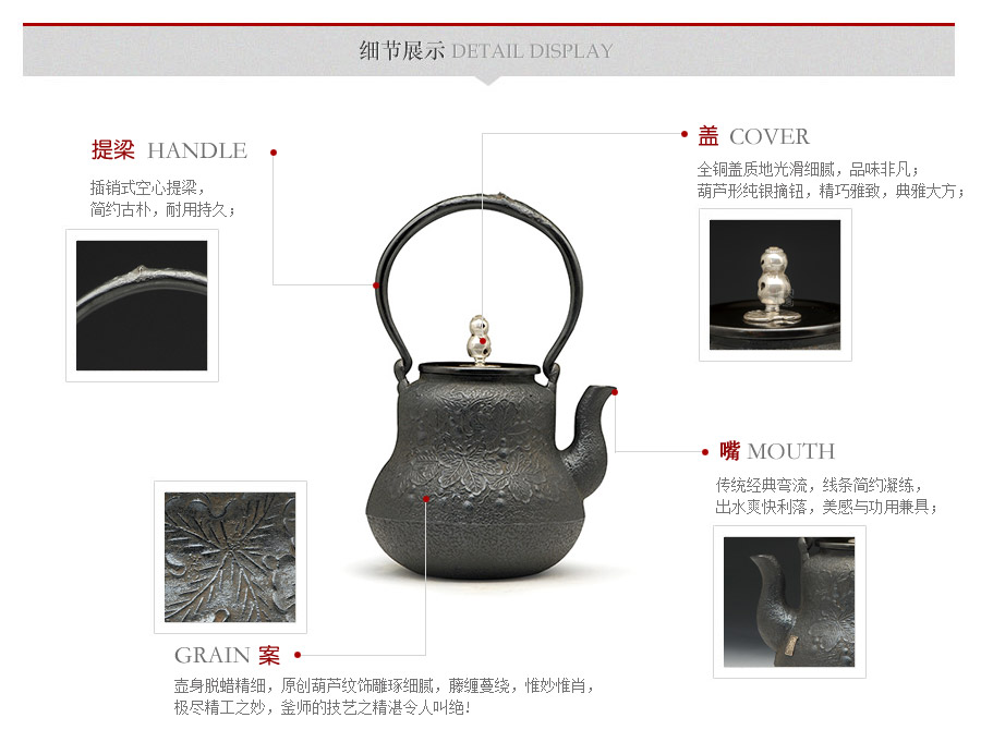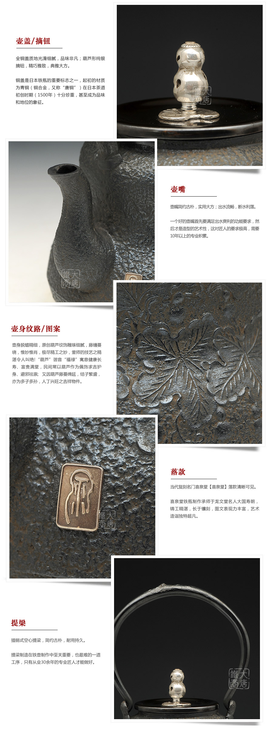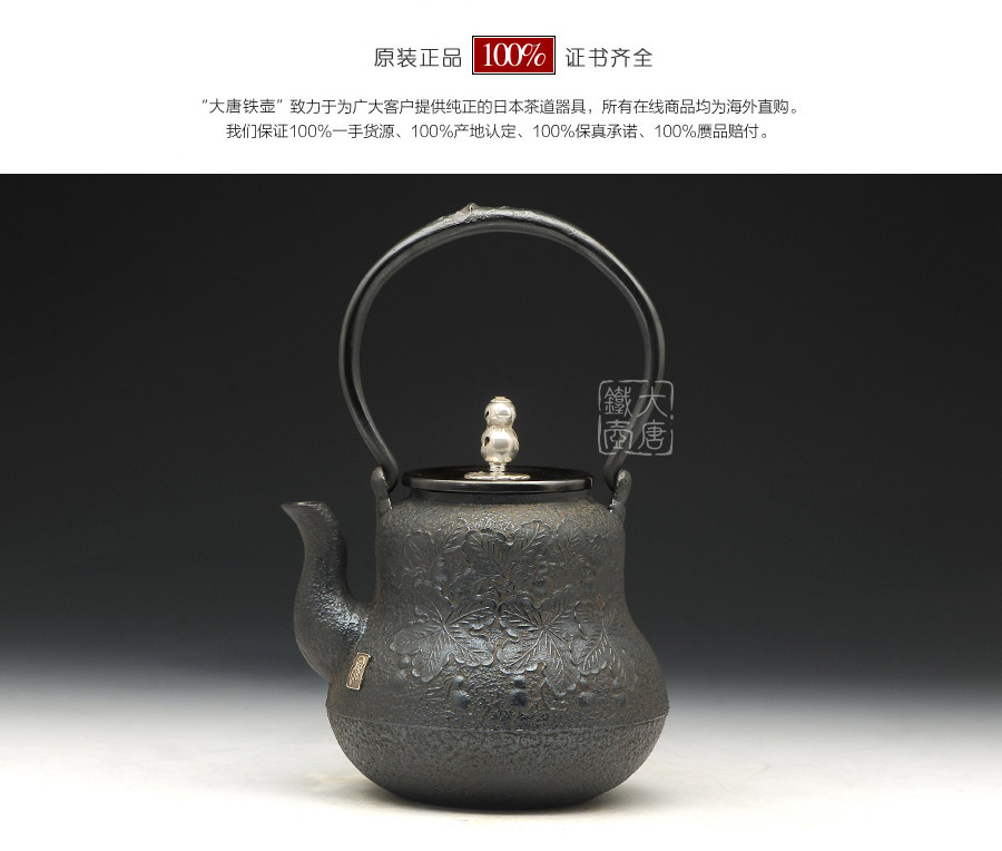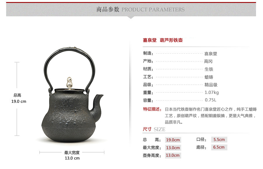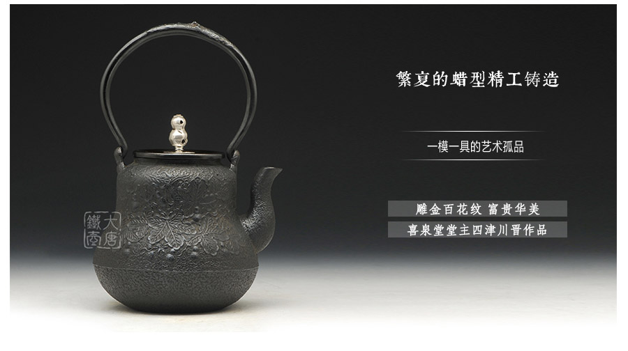 日本當(dāng)代鐵壺制作名門喜泉堂匠心之作,純手工蠟鑄工藝,原創(chuàng)葫蘆紋,搭配銅蓋銀摘,更顯大氣典雅,品質(zhì)非凡。