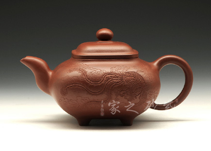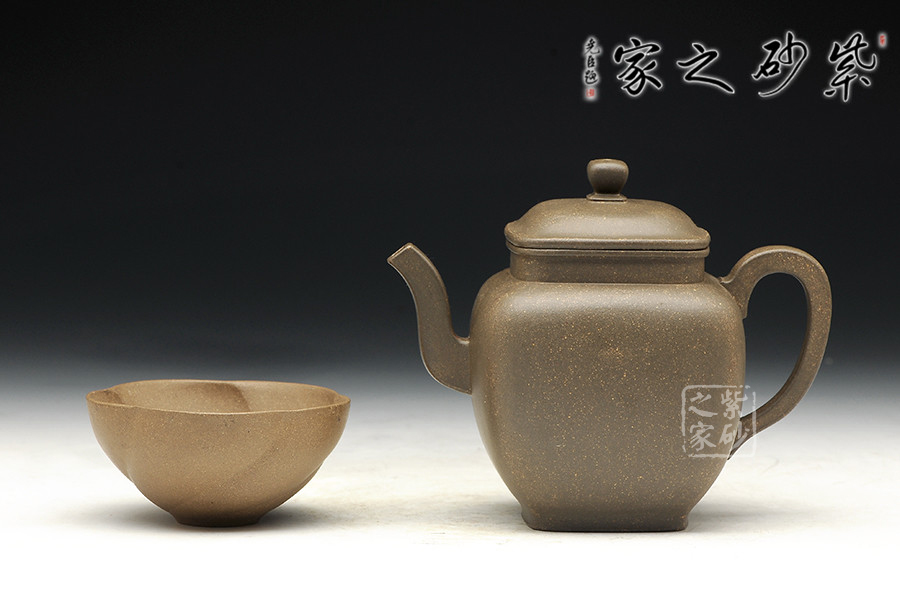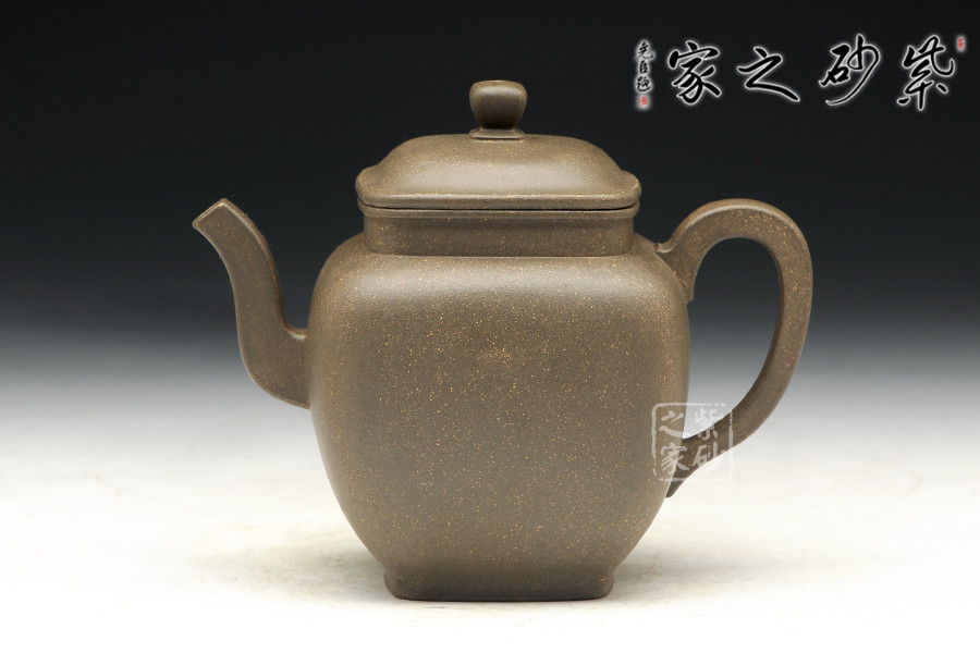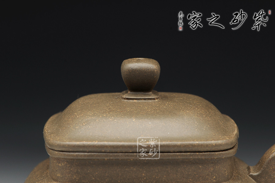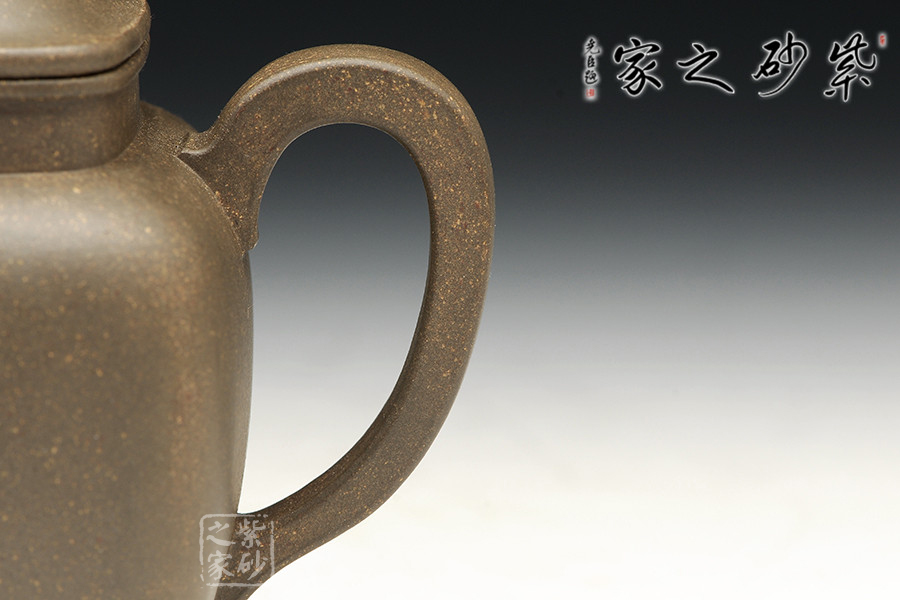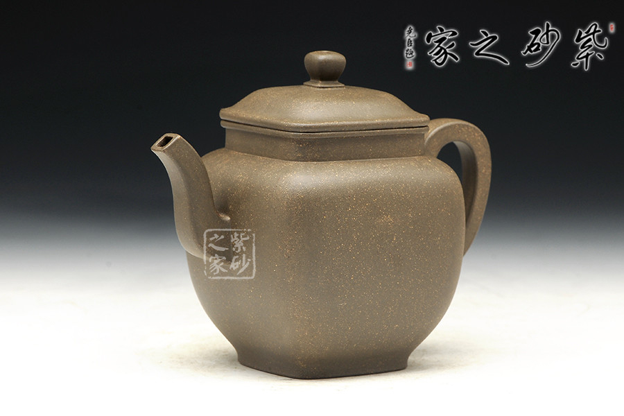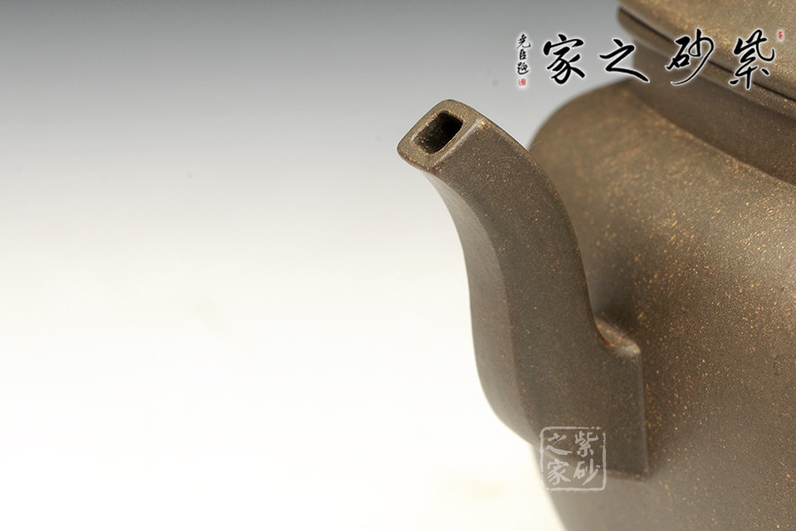 青灰段泥全手工制作,泥料古樸,老味十足,器型傳統(tǒng)不失新意,線條處理沒有棱角分明,更多的是圓融。整器點(diǎn)、線、面皆挺括,線條明朗利落,很有力度!壺體表面內(nèi)斂沉穩(wěn),彎流壺嘴和方形把對(duì)應(yīng)成趣,虛實(shí)結(jié)合的技巧讓人嘆服。四方型的壺身不呆板凝滯,上豐下斂,過渡漸變,氣韻端莊不俗。