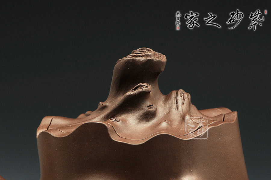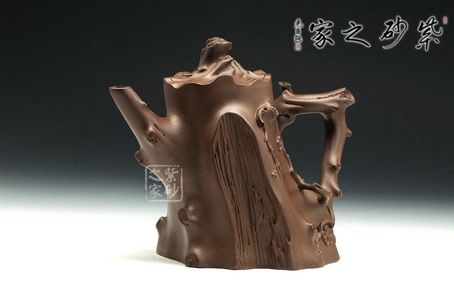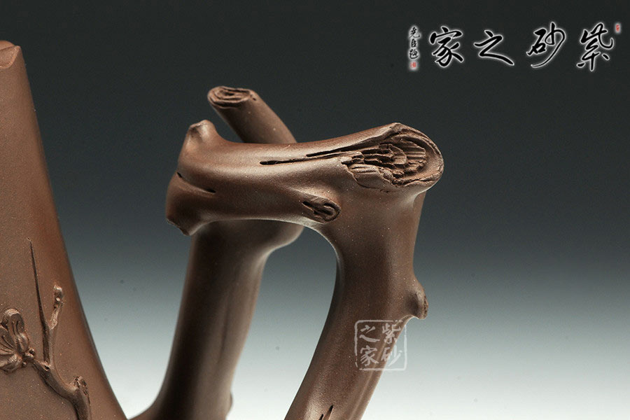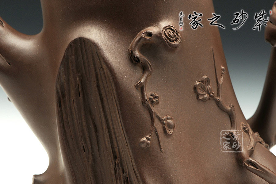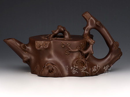 其所制花貨精壯老練、妙趣橫生,極賦生命力。整壺以一段梅樁為造型,盡顯此壺的氣勢與張力;壺鈕用一身段異形的梅枝為造型,以突出梅樹頑強(qiáng)的生命力,并以梅節(jié)等相輔之,豐富整個(gè)壺蓋的裝飾,也與壺身相呼應(yīng);壺嘴與壺把均以梅枝造型來表達(dá),宛如從梅樁壺身自然生成,剛勁有力。壺把以一枝蜿蜒盤曲,婀娜多姿的梅枝塑成,并與壺底連接處又有幾支組小梅枝延伸至壺身;此壺對(duì)于樹節(jié)的處理也是形態(tài)各異、契合自然。