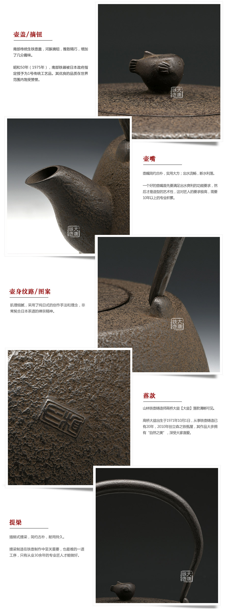 鐵壺鑄造師高橋大益出生于1971年10月1日,日本巖手縣矢巾町人。曾在盛岡市鐵器制造會社工作過13年,2010年辭職,同年4月創(chuàng)立自己的工房——“森之鐵瓶屋”。工房臨近盛岡市,藏身于日本雫石町一片茂林之中。雖然巖手縣聚集了一批從事鐵器制作的鑄造師,但是以“鐵瓶屋”命名的工房,卻獨此一家。“從出生開始,家里便一直有鐵壺的身影,幾乎每天都用著。數(shù)十年過去了,它還是那么堅固耐用,燒水時發(fā)出好聽的‘咕嚕咕嚕’聲。人也一樣,越沉淀越有韻味。”做了十多年的鐵壺,高橋大益手藝精湛,很受業(yè)界稱贊。自獨立以來,他希望能鑄造出擁有“自然之美”、“與現(xiàn)代生活相契合”與“具有實用價值”的器物。