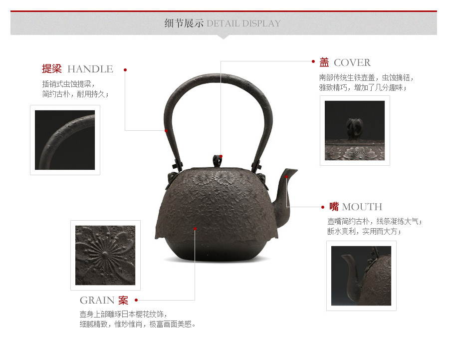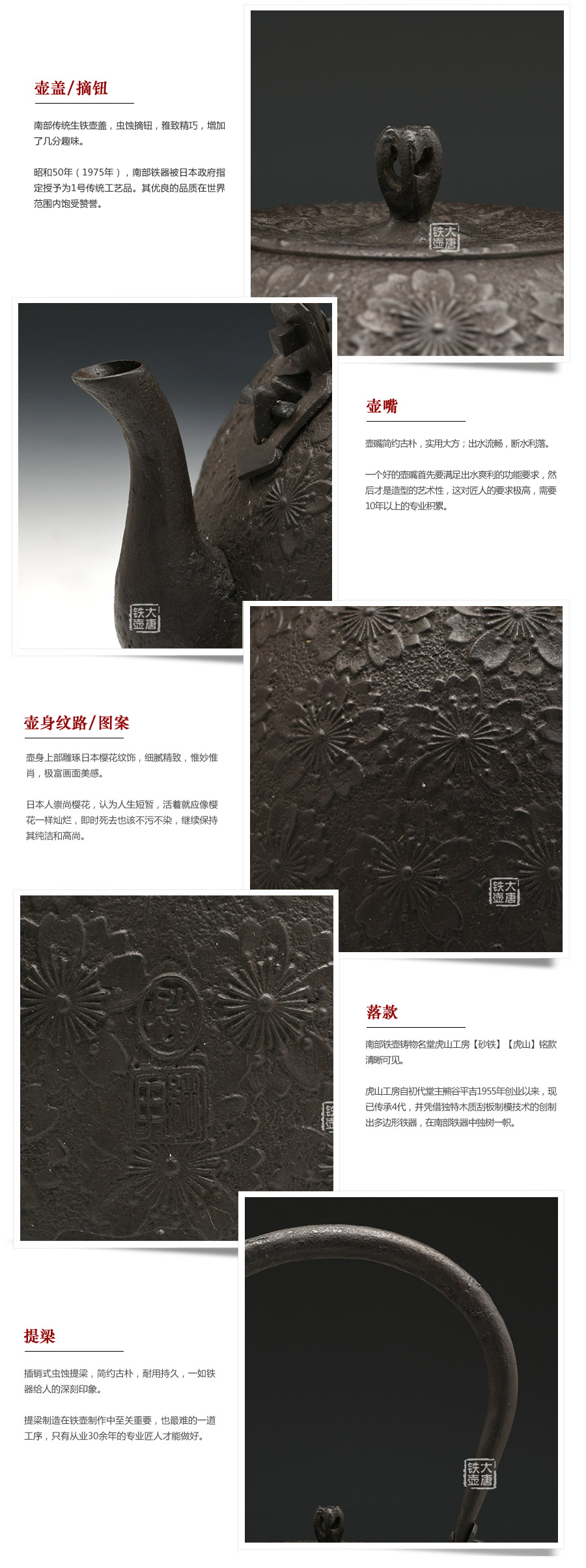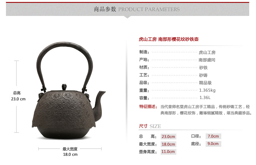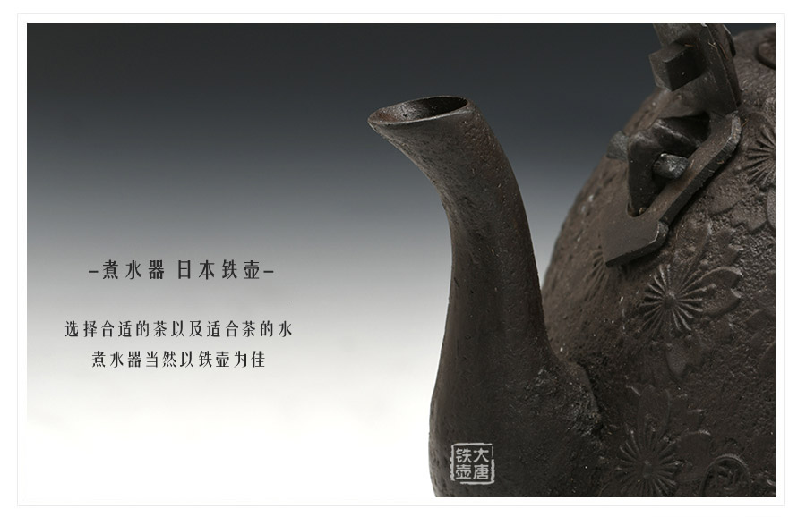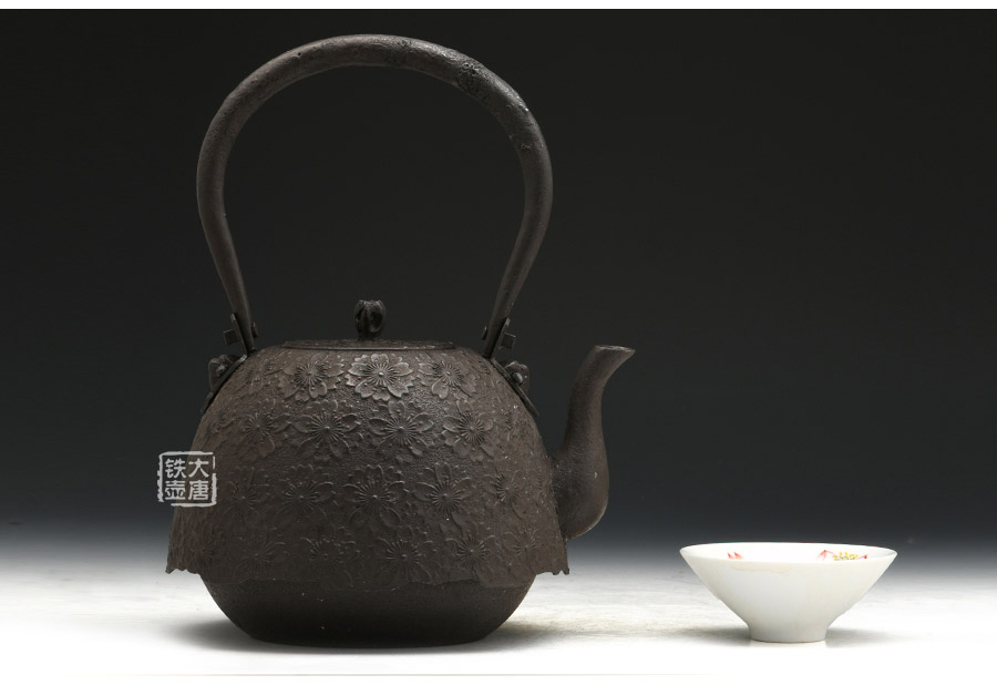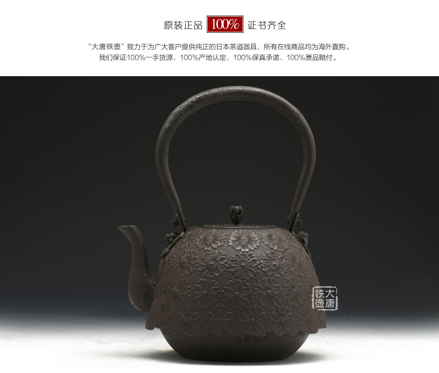 當代釜師名堂虎山工房手工精品,傳統(tǒng)砂鑄工藝,經(jīng)典南部形,櫻花紋飾,雕琢細膩精致,堪當?shù)洳卣淦贰?/p>