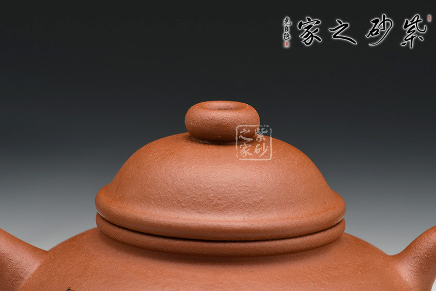 該壺泥質(zhì)微紅,珠粒隱現(xiàn),撫之光潤(rùn)。器身渾圓,壺嘴昂首而立,把作秋水款式,腹身飽滿,氣定神閑。口蓋以母子線相吻合,高聳挺拔,壺鈕形制特殊,作一圓圈,中留圈井,直通氣孔,結(jié)構(gòu)為歷來(lái)所僅見。整器雖小但力度十足,古樸的泥色,大氣的造型,彰顯了文人的樸雅風(fēng)格。把玩之間釀出自然的情趣,君子雅靜的氣息撲面而來(lái),禪趣溢然。