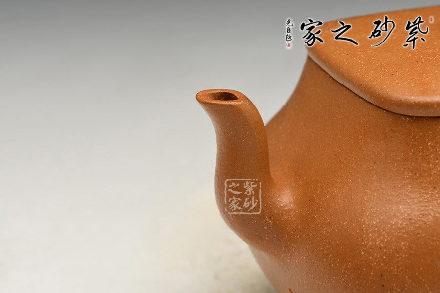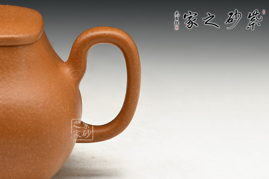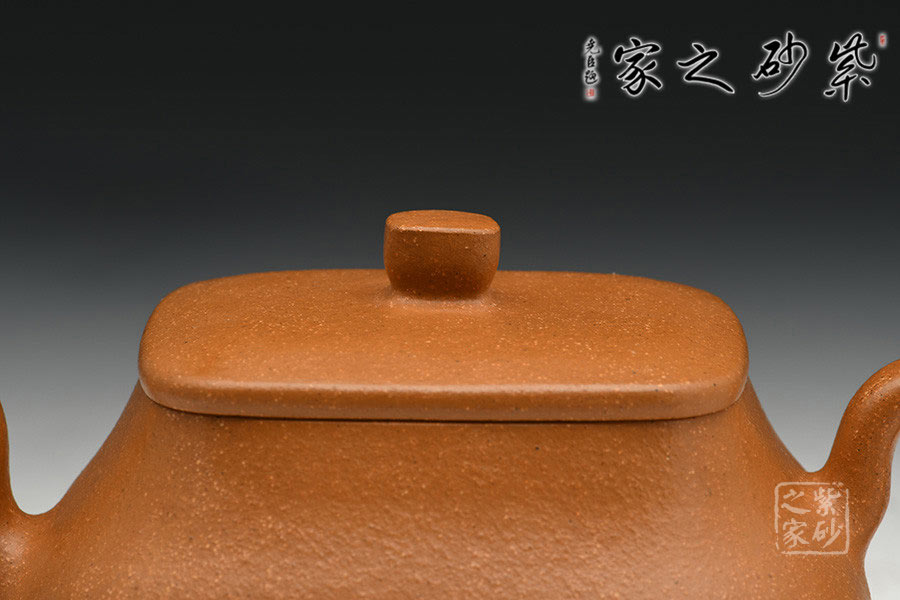 降坡泥泥料顏色古樸,黃中帶紅,燒成后壺體中的黃砂隱現(xiàn),作品線條簡(jiǎn)潔,力度凝重,韻涵有序,渾然天成。鈕、蓋、口、身以至圈足皆貫方中有圓,圓中有方,線條明晰工整,轉(zhuǎn)折合度。制壺手法干凈利落,成壺明快挺秀。細(xì)節(jié)刻畫(huà)清晰,圓中寓方,剛?cè)岵?jì),柔和大雅,注重藝術(shù)與人文的充分結(jié)合,營(yíng)造出素樸美好的情懷空間。