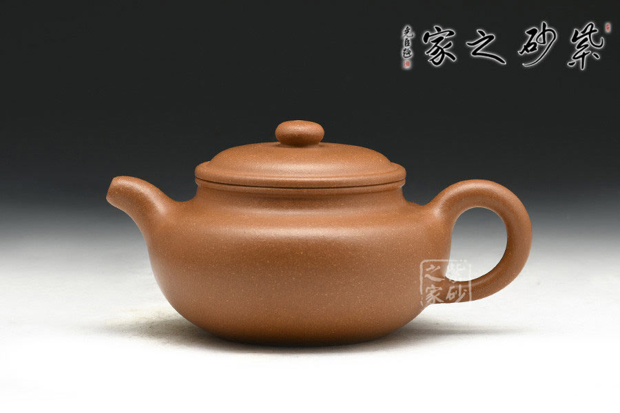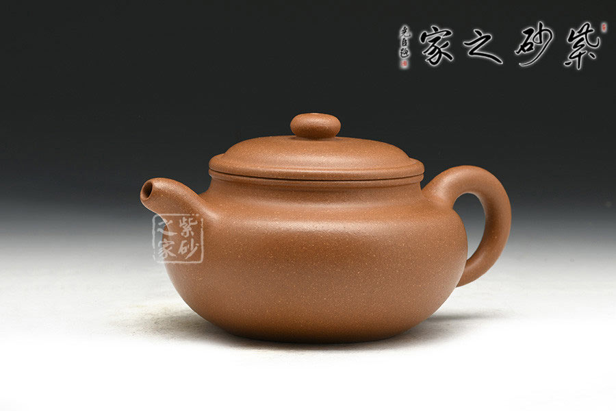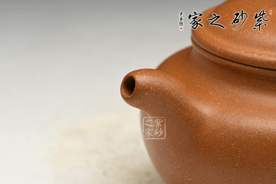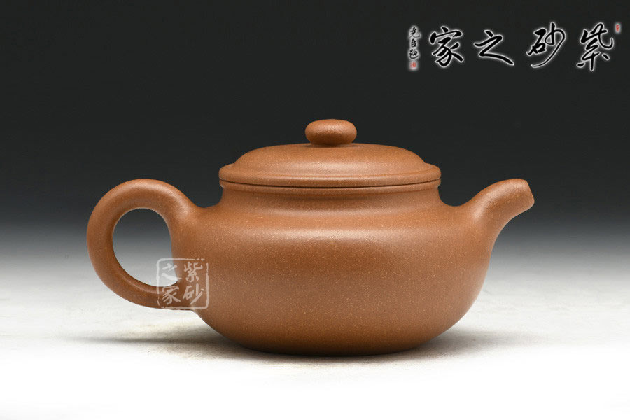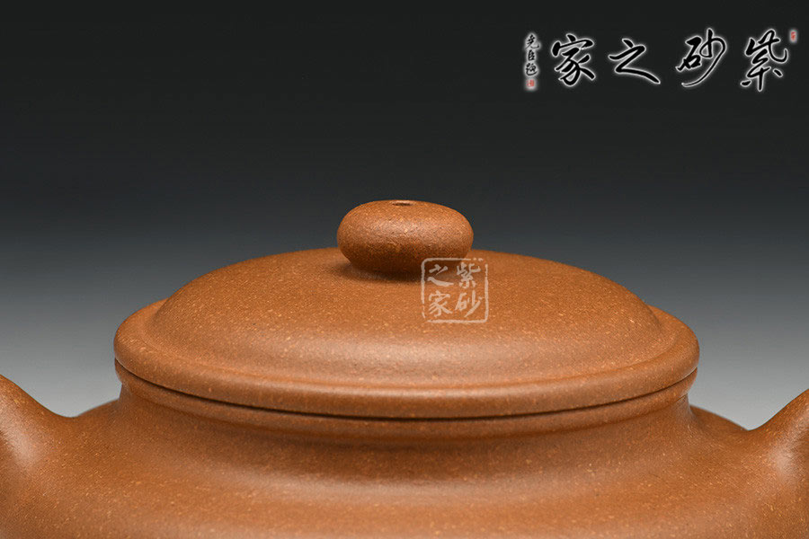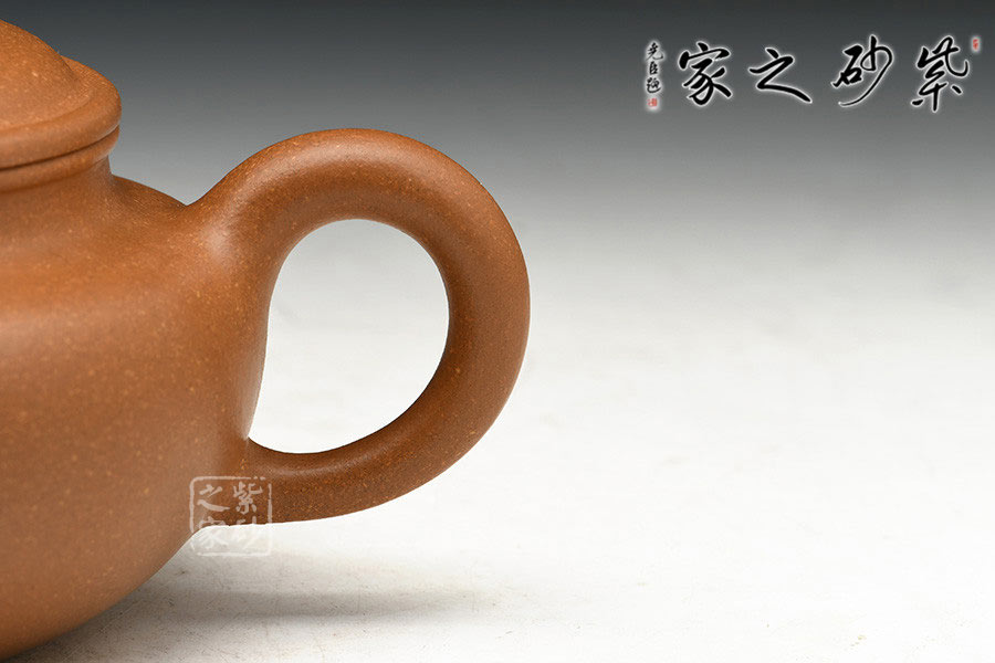 降坡泥顏色古樸,黃中帶紅,燒成后壺體中的黃砂隱現(xiàn),此壺造型端莊古樸,又頗含動(dòng)感。蓋與壺身渾成一體,流向上微屈力感十足,把則呈大橢圓形,壺底內(nèi)凹,母子線(xiàn)口蓋吻合嚴(yán)密,鈕扁圓對(duì)應(yīng)腹部,嘴、把勻稱(chēng),特別是蓋面制作別致,整體造型弧線(xiàn)優(yōu)美、線(xiàn)條流暢,視覺(jué)感也極為舒適,整把壺穩(wěn)健豐潤(rùn)。