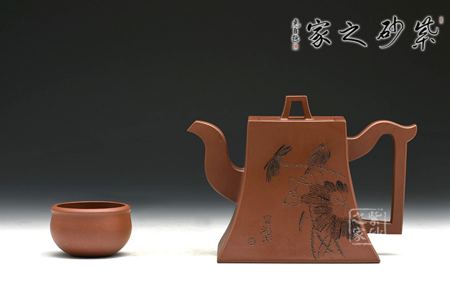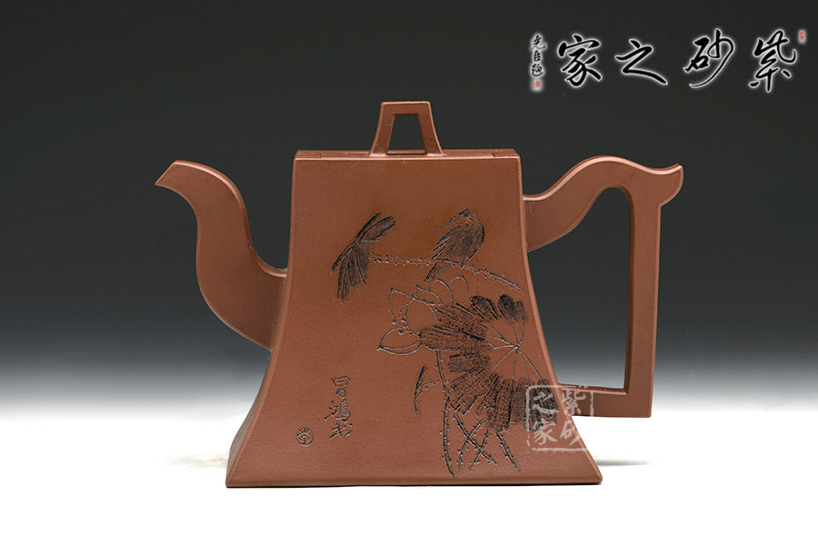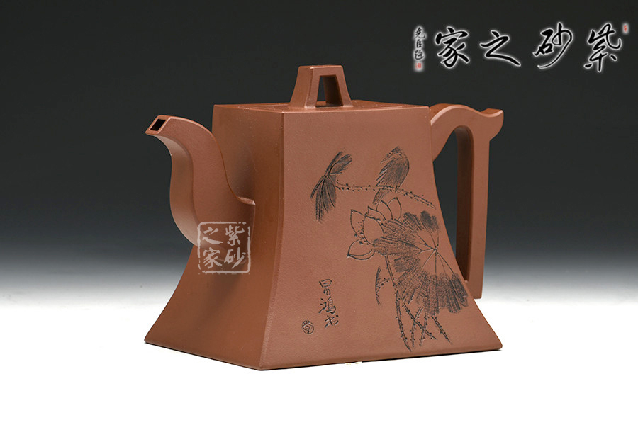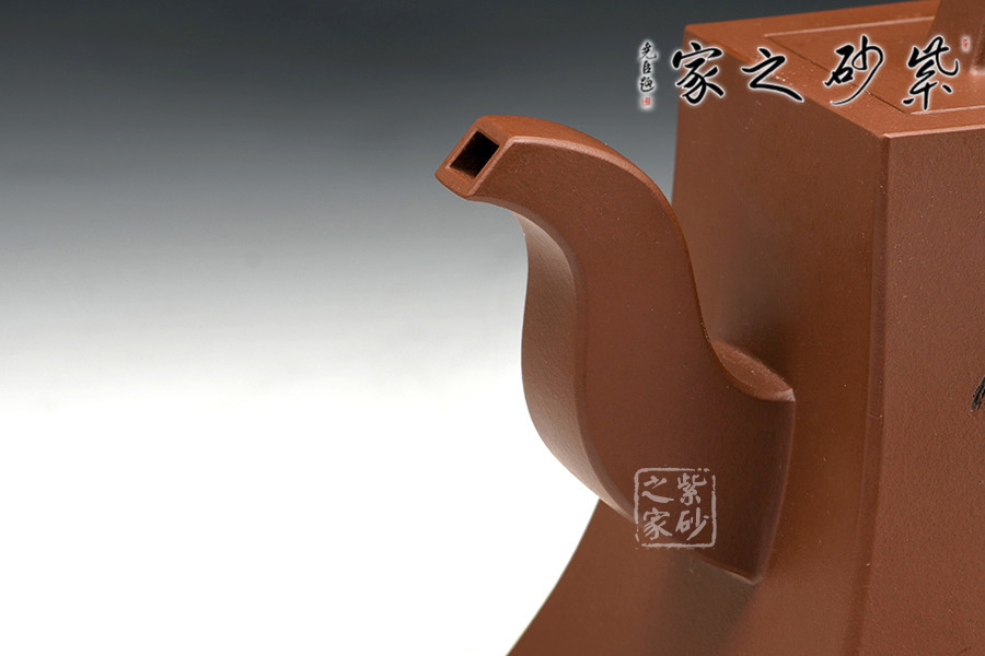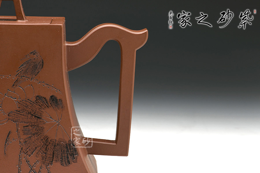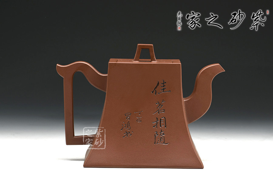 該作品造型簡練大方,于平淡中含濃烈,平易中顯新奇,一如人品質(zhì)樸自然,剛正不阿。以方鐘為形,底寬而穩(wěn),向肩線收縮,弧度洗練優(yōu)雅,壺身造行端莊特別,挺秀大方,蓋紐與壺身造型相同,上下相應,一虛一實平添韻味,三彎嘴與把背弧度前后呼應,大方自然,亦使方鐘壺更為生動。壺身裝飾由中國工藝美術大師李昌鴻題寫,價值立竿見影。