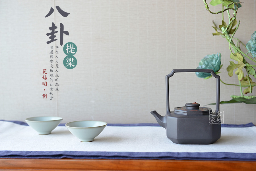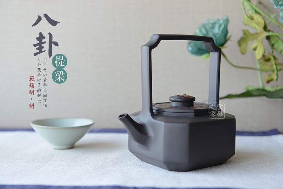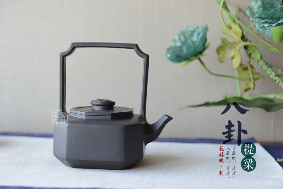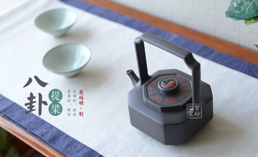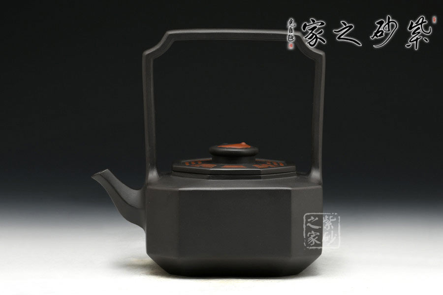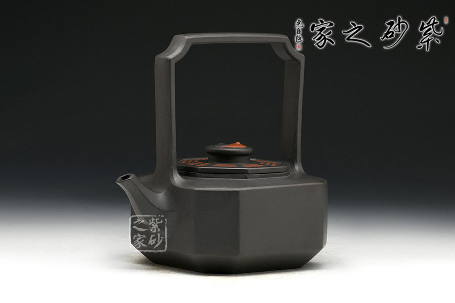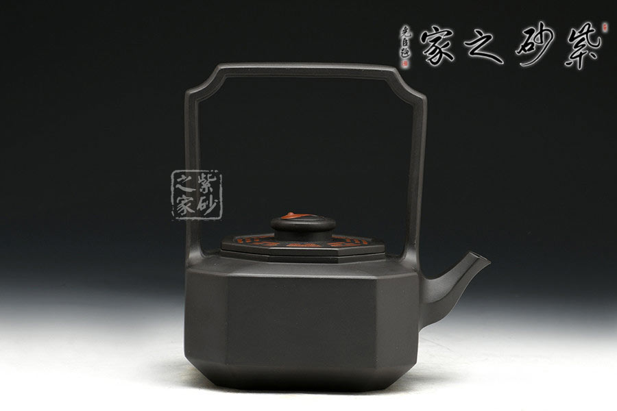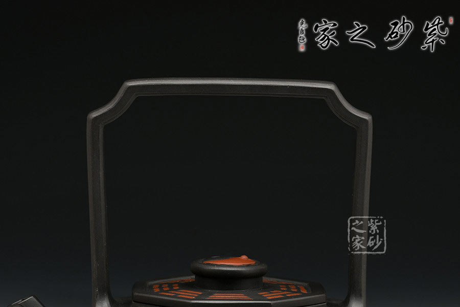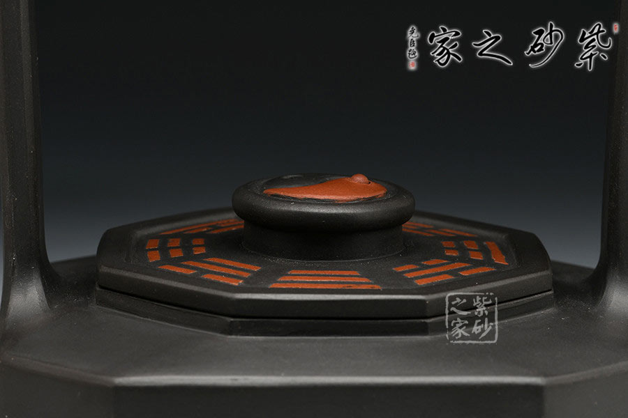 精選色黑如墨的黑泥為料,色澤神秘,引人向往。此壺壺身輪廓造型端莊周正,結(jié)構(gòu)嚴(yán)謹(jǐn),比例和諧勻稱,壺身線面簡(jiǎn)潔明快,制作一絲不茍。整器亮點(diǎn)在于壺蓋之上圖案設(shè)計(jì),以太極八卦圖飾于其上,融合中國(guó)道家文化;壺嘴舒出自然,提梁貫氣有力,整個(gè)造型簡(jiǎn)潔,柔中帶剛,集材質(zhì)美、工藝美、內(nèi)容美、形式美、功能美于一體,五美齊備,神氣韻皆具,堪稱壺中一絕。