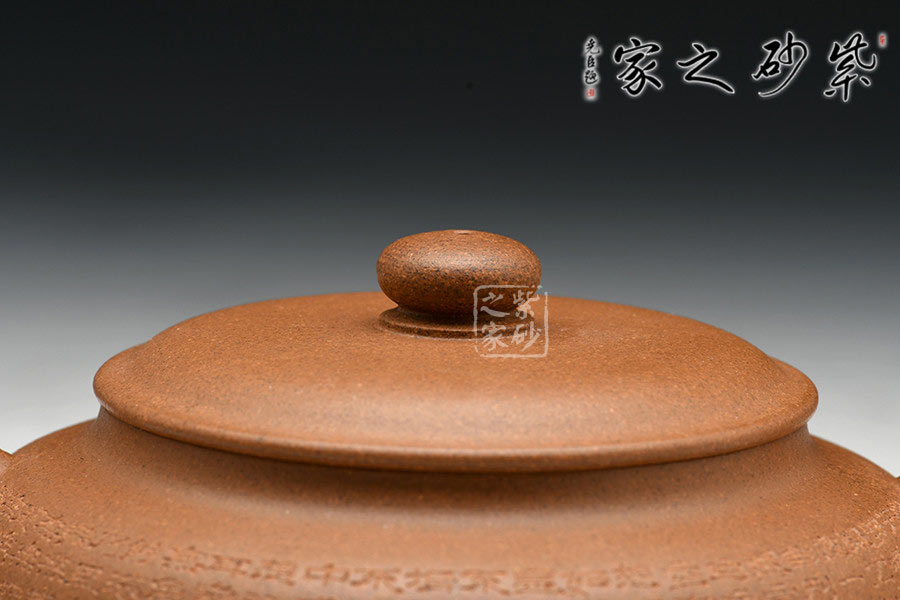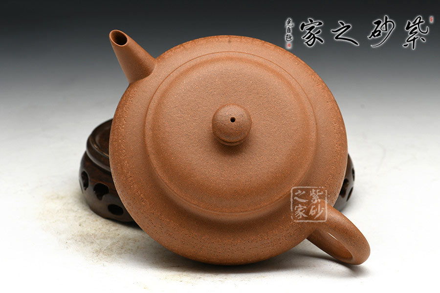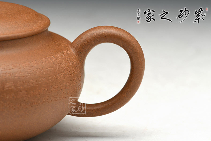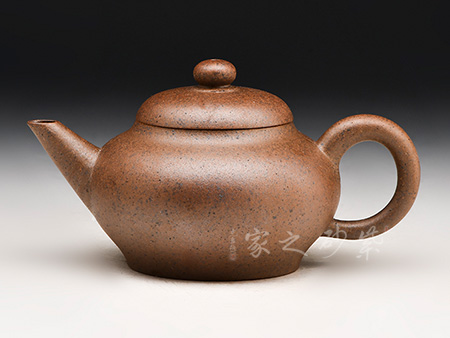 產(chǎn)量極少的黃金段泥為料,陳腐10余年,較為細(xì)膩,目數(shù)中等,養(yǎng)成后效果極佳。作品張力十足,矜持有度,壺身較扁,工藝難度大,表面手感光潤(rùn),顏色醇正細(xì)膩,造型古樸大方,令人賞心悅目。作品迷人的魅力蘊(yùn)藏于流暢的線(xiàn)條中,猶如吳帶當(dāng)風(fēng),既生動(dòng)的表現(xiàn)了作品的外部特征,又體現(xiàn)了內(nèi)在氣質(zhì),進(jìn)而達(dá)到了形神合一的高度統(tǒng)一。“素雅簡(jiǎn)練、彰顯精神”的審美特征在這里被發(fā)揮的淋漓盡致。以此壺淪茶品茗,頗有天真機(jī)趣縈繞席間,殊堪玩賞。