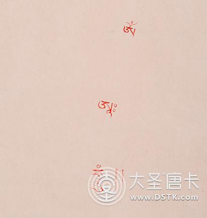 唐卡畫完后開光時,高僧大德一般在唐卡背面佛像,口意種子字"嗡阿吽",以顯現其加持之力。"嗡阿吽"三種子字是三世諸佛的心髓,也是一切佛菩薩身語意的根本種子字。