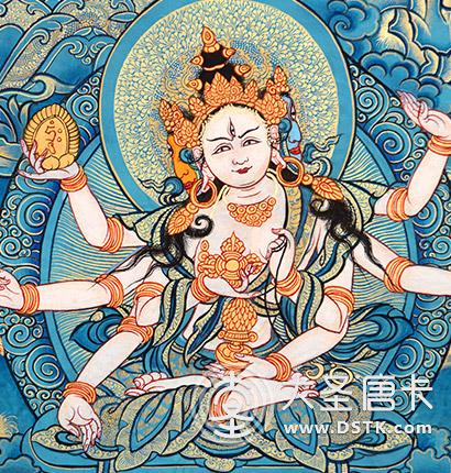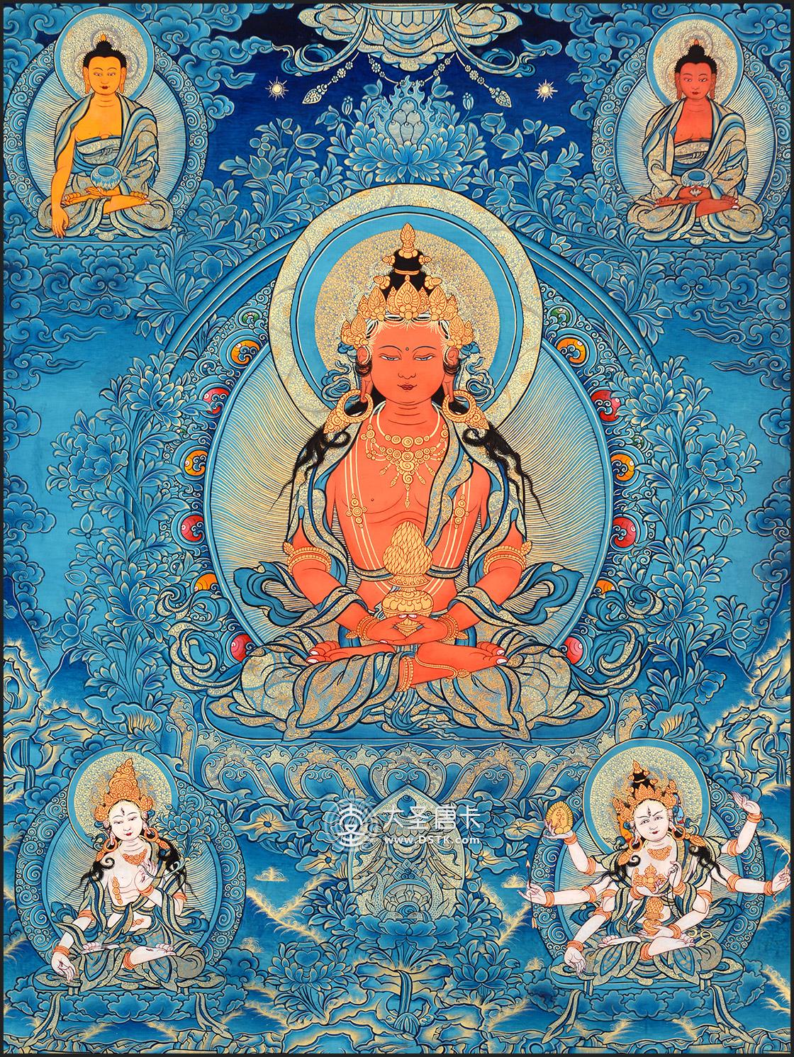 又稱烏瑟膩沙尊勝佛母、頂髻尊勝佛母、佛頂尊勝佛母。尊勝佛母乃長壽三尊之一,三面八臂,面上各具三眼,面容兼具寂靜、愉悅與兇忿相,身如秋月,皎白無瑕,貌如妙齡少女?;?、天衣、寶冠、瓔珞等莊嚴(yán),安坐於蓮花月輪上。