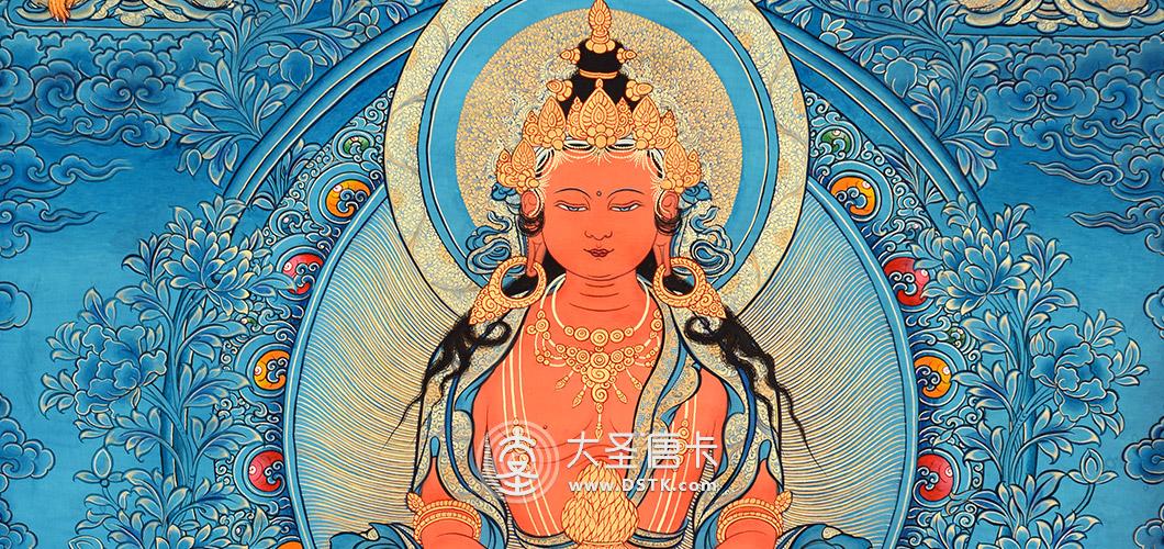 又稱為增壽救度佛母,是觀音悲心的示現(xiàn),是圣救度母的二十一尊化身之一。其面生三目,手心、足心各具一目,共具七只眼睛,所以稱為七眼佛母。頭頂挽著花狀發(fā)髻、兩肩垂下、幾處發(fā)辮、耳環(huán)、手鐲、指環(huán)、臂圈,腳鐲具足,寶珠瓔珞遍體。第一串繞頸、第二串繞胸、第三圈繞臍,細(xì)腰豐乳、如妙齡少女。右手置膝施接引印、左手當(dāng)胸,以三寶印捻烏巴拉花
