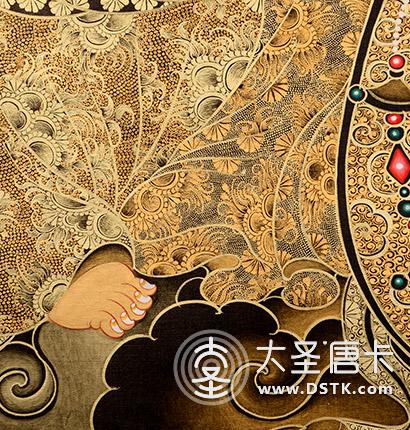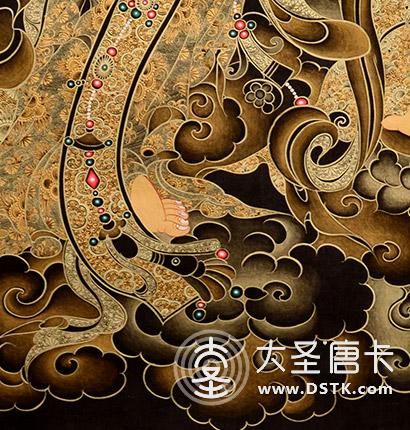 黑金工藝 黑金唐卡,以黑色為基底,用純金色勾勒,點綴少量色彩或象征性的暈染出人物和景物的主要結構及明暗,在藏傳佛教藝術中與彩繪唐卡一脈相承,而又自成一體的繪畫形式“黑金唐卡”,藏語稱“那唐”。黑金唐卡藝術在藏傳佛教密宗文化的教理儀軌內涵下產生,是藏傳佛教文化思想的大智創造,凝聚著歷代高僧大德、民間藝匠的智慧。