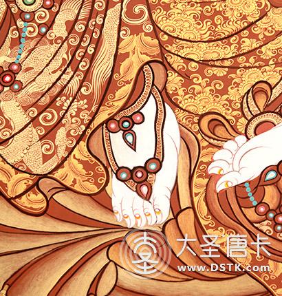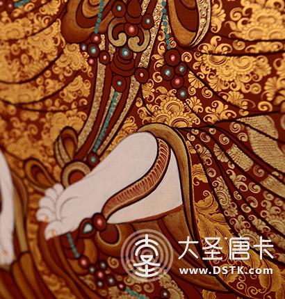 暗紅色朱砂鋪底,朱砂是唐卡上紅色之根本,紅唐的整個底色,都是用朱砂繪制而成。在繪制佛像服飾等位置時,用刻金技法,使圖案更具豐富的層次和立體感,用金勾勒的線條和圖案不但明亮度進一步提高,讓畫面更加燦爛,而且也使金在畫面上保持得更加長久。