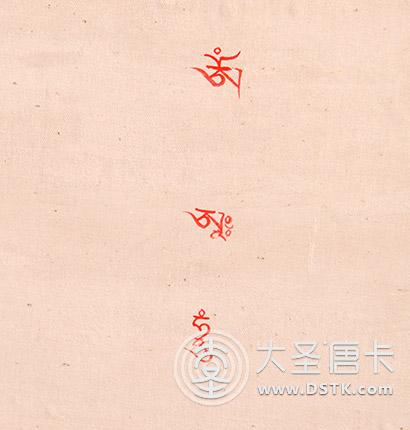 唐卡畫完后開光時,高僧大德一般在唐卡背面佛像,口意種子字"嗡阿吽",以顯現其加持之力。"嗡阿吽"三種子字是三世諸佛的心髓,也是一切佛菩薩身語意的根本種子字。